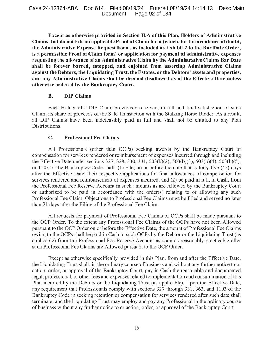 16 Except as otherwise provided in Section II.A of this Plan, Holders of Administrative Claims that do not File an applicable Proof of Claim form (which, for the avoidance of doubt, the Administrative Expense Request Form, as included as Exhibit 2 to the Bar Date Order, is a permissible Proof of Claim form) or application for payment of administrative expenses requesting the allowance of an Administrative Claim by the Administrative Claims Bar Date shall be forever barred, estopped, and enjoined from asserting Administrative Claims against the Debtors, the Liquidating Trust, the Estates, or the Debtors’ assets and properties, and any Administrative Claims shall be deemed disallowed as of the Effective Date unless otherwise ordered by the Bankruptcy Court. B. DIP Claims Each Holder of a DIP Claim previously received, in full and final satisfaction of such Claim, its share of proceeds of the Sale Transaction with the Stalking Horse Bidder. As a result, all DIP Claims have been indefeasibly paid in full and shall not be entitled to any Plan Distributions. C. Professional Fee Claims All Professionals (other than OCPs) seeking awards by the Bankruptcy Court of compensation for services rendered or reimbursement of expenses incurred through and including the Effective Date under sections 327, 328, 330, 331, 503(b)(2), 503(b)(3), 503(b)(4), 503(b)(5), or 1103 of the Bankruptcy Code shall: (1) File, on or before the date that is forty-five (45) days after the Effective Date, their respective applications for final allowances of compensation for services rendered and reimbursement of expenses incurred; and (2) be paid in full, in Cash, from the Professional Fee Reserve Account in such amounts as are Allowed by the Bankruptcy Court or authorized to be paid in accordance with the order(s) relating to or allowing any such Professional Fee Claim. Objections to Professional Fee Claims must be Filed and served no later than 21 days after the Filing of the Professional Fee Claim. All requests for payment of Professional Fee Claims of OCPs shall be made pursuant to the OCP Order. To the extent any Professional Fee Claims of the OCPs have not been Allowed pursuant to the OCP Order on or before the Effective Date, the amount of Professional Fee Claims owing to the OCPs shall be paid in Cash to such OCPs by the Debtor or the Liquidating Trust (as applicable) from the Professional Fee Reserve Account as soon as reasonably practicable after such Professional Fee Claims are Allowed pursuant to the OCP Order. Except as otherwise specifically provided in this Plan, from and after the Effective Date, the Liquidating Trust shall, in the ordinary course of business and without any further notice to or action, order, or approval of the Bankruptcy Court, pay in Cash the reasonable and documented legal, professional, or other fees and expenses related to implementation and consummation of this Plan incurred by the Debtors or the Liquidating Trust (as applicable). Upon the Effective Date, any requirement that Professionals comply with sections 327 through 331, 363, and 1103 of the Bankruptcy Code in seeking retention or compensation for services rendered after such date shall terminate, and the Liquidating Trust may employ and pay any Professional in the ordinary course of business without any further notice to or action, order, or approval of the Bankruptcy Court. Case 24-12364-ABA Doc 614 Filed 08/19/24 Entered 08/19/24 14:14:13 Desc Main Document Page 92 of 134