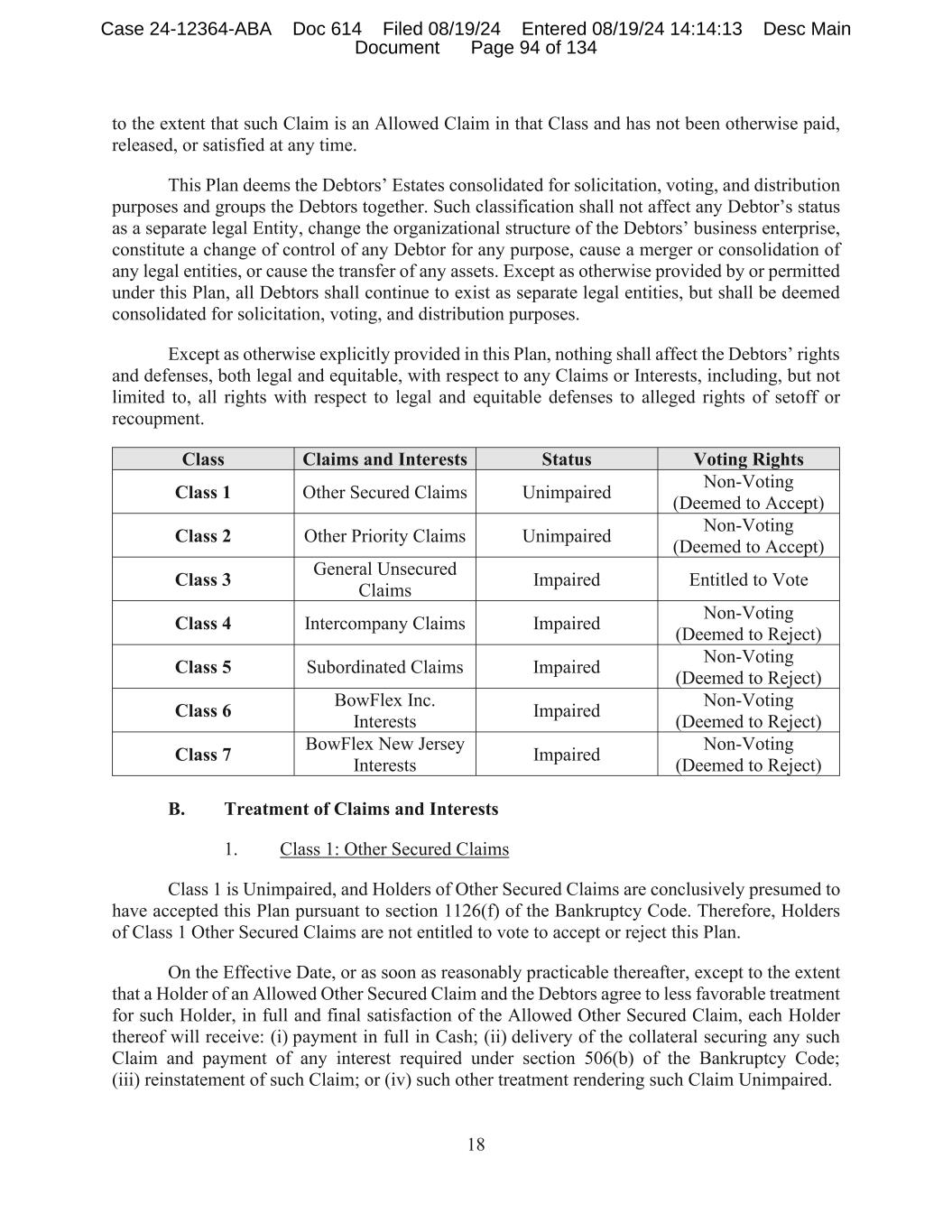 18 to the extent that such Claim is an Allowed Claim in that Class and has not been otherwise paid, released, or satisfied at any time. This Plan deems the Debtors’ Estates consolidated for solicitation, voting, and distribution purposes and groups the Debtors together. Such classification shall not affect any Debtor’s status as a separate legal Entity, change the organizational structure of the Debtors’ business enterprise, constitute a change of control of any Debtor for any purpose, cause a merger or consolidation of any legal entities, or cause the transfer of any assets. Except as otherwise provided by or permitted under this Plan, all Debtors shall continue to exist as separate legal entities, but shall be deemed consolidated for solicitation, voting, and distribution purposes. Except as otherwise explicitly provided in this Plan, nothing shall affect the Debtors’ rights and defenses, both legal and equitable, with respect to any Claims or Interests, including, but not limited to, all rights with respect to legal and equitable defenses to alleged rights of setoff or recoupment. Class Claims and Interests Status Voting Rights Class 1 Other Secured Claims Unimpaired Non-Voting (Deemed to Accept) Class 2 Other Priority Claims Unimpaired Non-Voting (Deemed to Accept) Class 3 General Unsecured Claims Impaired Entitled to Vote Class 4 Intercompany Claims Impaired Non-Voting (Deemed to Reject) Class 5 Subordinated Claims Impaired Non-Voting (Deemed to Reject) Class 6 BowFlex Inc. Interests Impaired Non-Voting (Deemed to Reject) Class 7 BowFlex New Jersey Interests Impaired Non-Voting (Deemed to Reject) B. Treatment of Claims and Interests 1. Class 1: Other Secured Claims Class 1 is Unimpaired, and Holders of Other Secured Claims are conclusively presumed to have accepted this Plan pursuant to section 1126(f) of the Bankruptcy Code. Therefore, Holders of Class 1 Other Secured Claims are not entitled to vote to accept or reject this Plan. On the Effective Date, or as soon as reasonably practicable thereafter, except to the extent that a Holder of an Allowed Other Secured Claim and the Debtors agree to less favorable treatment for such Holder, in full and final satisfaction of the Allowed Other Secured Claim, each Holder thereof will receive: (i) payment in full in Cash; (ii) delivery of the collateral securing any such Claim and payment of any interest required under section 506(b) of the Bankruptcy Code; (iii) reinstatement of such Claim; or (iv) such other treatment rendering such Claim Unimpaired. Case 24-12364-ABA Doc 614 Filed 08/19/24 Entered 08/19/24 14:14:13 Desc Main Document Page 94 of 134