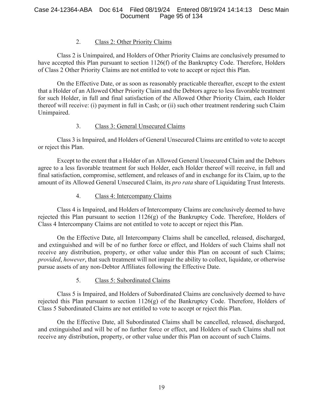 19 2. Class 2: Other Priority Claims Class 2 is Unimpaired, and Holders of Other Priority Claims are conclusively presumed to have accepted this Plan pursuant to section 1126(f) of the Bankruptcy Code. Therefore, Holders of Class 2 Other Priority Claims are not entitled to vote to accept or reject this Plan. On the Effective Date, or as soon as reasonably practicable thereafter, except to the extent that a Holder of an Allowed Other Priority Claim and the Debtors agree to less favorable treatment for such Holder, in full and final satisfaction of the Allowed Other Priority Claim, each Holder thereof will receive: (i) payment in full in Cash; or (ii) such other treatment rendering such Claim Unimpaired. 3. Class 3: General Unsecured Claims Class 3 is Impaired, and Holders of General Unsecured Claims are entitled to vote to accept or reject this Plan. Except to the extent that a Holder of an Allowed General Unsecured Claim and the Debtors agree to a less favorable treatment for such Holder, each Holder thereof will receive, in full and final satisfaction, compromise, settlement, and releases of and in exchange for its Claim, up to the amount of its Allowed General Unsecured Claim, its pro rata share of Liquidating Trust Interests. 4. Class 4: Intercompany Claims Class 4 is Impaired, and Holders of Intercompany Claims are conclusively deemed to have rejected this Plan pursuant to section 1126(g) of the Bankruptcy Code. Therefore, Holders of Class 4 Intercompany Claims are not entitled to vote to accept or reject this Plan. On the Effective Date, all Intercompany Claims shall be cancelled, released, discharged, and extinguished and will be of no further force or effect, and Holders of such Claims shall not receive any distribution, property, or other value under this Plan on account of such Claims; provided, however, that such treatment will not impair the ability to collect, liquidate, or otherwise pursue assets of any non-Debtor Affiliates following the Effective Date. 5. Class 5: Subordinated Claims Class 5 is Impaired, and Holders of Subordinated Claims are conclusively deemed to have rejected this Plan pursuant to section 1126(g) of the Bankruptcy Code. Therefore, Holders of Class 5 Subordinated Claims are not entitled to vote to accept or reject this Plan. On the Effective Date, all Subordinated Claims shall be cancelled, released, discharged, and extinguished and will be of no further force or effect, and Holders of such Claims shall not receive any distribution, property, or other value under this Plan on account of such Claims. Case 24-12364-ABA Doc 614 Filed 08/19/24 Entered 08/19/24 14:14:13 Desc Main Document Page 95 of 134