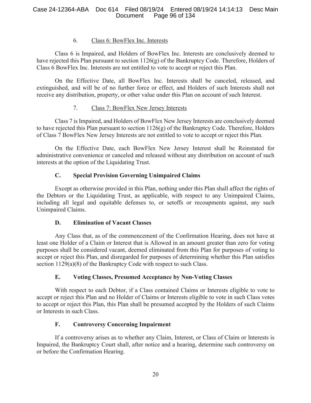 20 6. Class 6: BowFlex Inc. Interests Class 6 is Impaired, and Holders of BowFlex Inc. Interests are conclusively deemed to have rejected this Plan pursuant to section 1126(g) of the Bankruptcy Code. Therefore, Holders of Class 6 BowFlex Inc. Interests are not entitled to vote to accept or reject this Plan. On the Effective Date, all BowFlex Inc. Interests shall be canceled, released, and extinguished, and will be of no further force or effect, and Holders of such Interests shall not receive any distribution, property, or other value under this Plan on account of such Interest. 7. Class 7: BowFlex New Jersey Interests Class 7 is Impaired, and Holders of BowFlex New Jersey Interests are conclusively deemed to have rejected this Plan pursuant to section 1126(g) of the Bankruptcy Code. Therefore, Holders of Class 7 BowFlex New Jersey Interests are not entitled to vote to accept or reject this Plan. On the Effective Date, each BowFlex New Jersey Interest shall be Reinstated for administrative convenience or canceled and released without any distribution on account of such interests at the option of the Liquidating Trust. C. Special Provision Governing Unimpaired Claims Except as otherwise provided in this Plan, nothing under this Plan shall affect the rights of the Debtors or the Liquidating Trust, as applicable, with respect to any Unimpaired Claims, including all legal and equitable defenses to, or setoffs or recoupments against, any such Unimpaired Claims. D. Elimination of Vacant Classes Any Class that, as of the commencement of the Confirmation Hearing, does not have at least one Holder of a Claim or Interest that is Allowed in an amount greater than zero for voting purposes shall be considered vacant, deemed eliminated from this Plan for purposes of voting to accept or reject this Plan, and disregarded for purposes of determining whether this Plan satisfies section 1129(a)(8) of the Bankruptcy Code with respect to such Class. E. Voting Classes, Presumed Acceptance by Non-Voting Classes With respect to each Debtor, if a Class contained Claims or Interests eligible to vote to accept or reject this Plan and no Holder of Claims or Interests eligible to vote in such Class votes to accept or reject this Plan, this Plan shall be presumed accepted by the Holders of such Claims or Interests in such Class. F. Controversy Concerning Impairment If a controversy arises as to whether any Claim, Interest, or Class of Claim or Interests is Impaired, the Bankruptcy Court shall, after notice and a hearing, determine such controversy on or before the Confirmation Hearing. Case 24-12364-ABA Doc 614 Filed 08/19/24 Entered 08/19/24 14:14:13 Desc Main Document Page 96 of 134