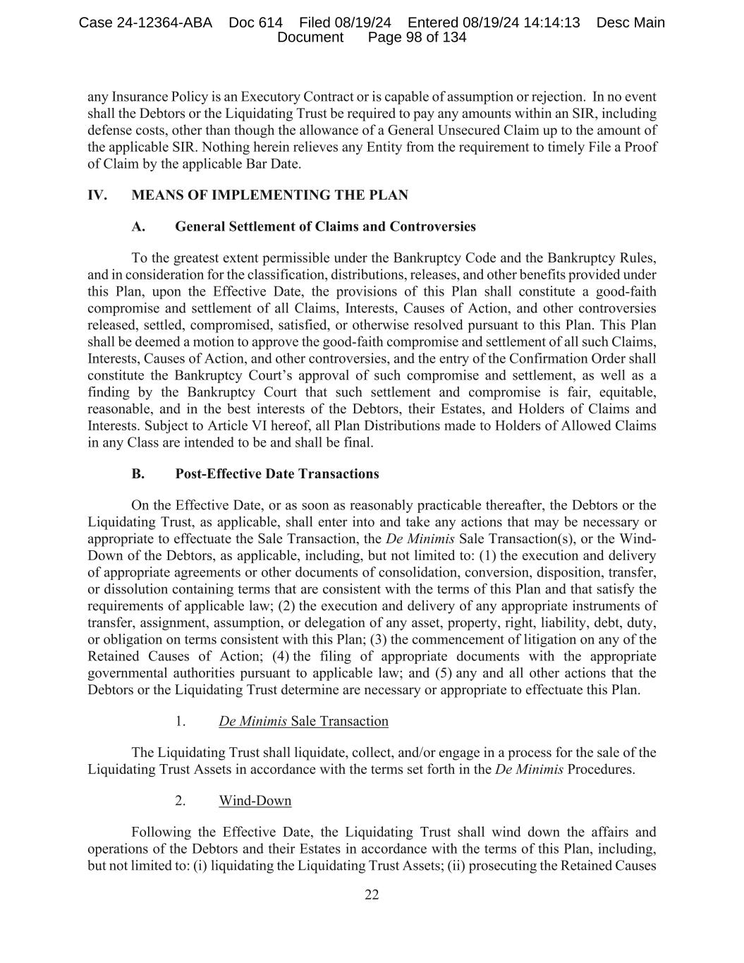 22 any Insurance Policy is an Executory Contract or is capable of assumption or rejection. In no event shall the Debtors or the Liquidating Trust be required to pay any amounts within an SIR, including defense costs, other than though the allowance of a General Unsecured Claim up to the amount of the applicable SIR. Nothing herein relieves any Entity from the requirement to timely File a Proof of Claim by the applicable Bar Date. IV. MEANS OF IMPLEMENTING THE PLAN A. General Settlement of Claims and Controversies To the greatest extent permissible under the Bankruptcy Code and the Bankruptcy Rules, and in consideration for the classification, distributions, releases, and other benefits provided under this Plan, upon the Effective Date, the provisions of this Plan shall constitute a good-faith compromise and settlement of all Claims, Interests, Causes of Action, and other controversies released, settled, compromised, satisfied, or otherwise resolved pursuant to this Plan. This Plan shall be deemed a motion to approve the good-faith compromise and settlement of all such Claims, Interests, Causes of Action, and other controversies, and the entry of the Confirmation Order shall constitute the Bankruptcy Court’s approval of such compromise and settlement, as well as a finding by the Bankruptcy Court that such settlement and compromise is fair, equitable, reasonable, and in the best interests of the Debtors, their Estates, and Holders of Claims and Interests. Subject to Article VI hereof, all Plan Distributions made to Holders of Allowed Claims in any Class are intended to be and shall be final. B. Post-Effective Date Transactions On the Effective Date, or as soon as reasonably practicable thereafter, the Debtors or the Liquidating Trust, as applicable, shall enter into and take any actions that may be necessary or appropriate to effectuate the Sale Transaction, the De Minimis Sale Transaction(s), or the Wind- Down of the Debtors, as applicable, including, but not limited to: (1) the execution and delivery of appropriate agreements or other documents of consolidation, conversion, disposition, transfer, or dissolution containing terms that are consistent with the terms of this Plan and that satisfy the requirements of applicable law; (2) the execution and delivery of any appropriate instruments of transfer, assignment, assumption, or delegation of any asset, property, right, liability, debt, duty, or obligation on terms consistent with this Plan; (3) the commencement of litigation on any of the Retained Causes of Action; (4) the filing of appropriate documents with the appropriate governmental authorities pursuant to applicable law; and (5) any and all other actions that the Debtors or the Liquidating Trust determine are necessary or appropriate to effectuate this Plan. 1. De Minimis Sale Transaction The Liquidating Trust shall liquidate, collect, and/or engage in a process for the sale of the Liquidating Trust Assets in accordance with the terms set forth in the De Minimis Procedures. 2. Wind-Down Following the Effective Date, the Liquidating Trust shall wind down the affairs and operations of the Debtors and their Estates in accordance with the terms of this Plan, including, but not limited to: (i) liquidating the Liquidating Trust Assets; (ii) prosecuting the Retained Causes Case 24-12364-ABA Doc 614 Filed 08/19/24 Entered 08/19/24 14:14:13 Desc Main Document Page 98 of 134