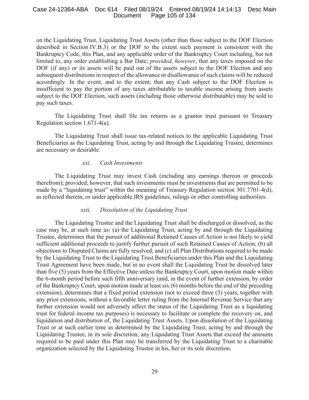 29 on the Liquidating Trust, Liquidating Trust Assets (other than those subject to the DOF Election described in Section IV.B.3) or the DOF to the extent such payment is consistent with the Bankruptcy Code, this Plan, and any applicable order of the Bankruptcy Court including, but not limited to, any order establishing a Bar Date; provided, however, that any taxes imposed on the DOF (if any) or its assets will be paid out of the assets subject to the DOF Election and any subsequent distributions in respect of the allowance or disallowance of such claims will be reduced accordingly. In the event, and to the extent, that any Cash subject to the DOF Election is insufficient to pay the portion of any taxes attributable to taxable income arising from assets subject to the DOF Election, such assets (including those otherwise distributable) may be sold to pay such taxes. The Liquidating Trust shall file tax returns as a grantor trust pursuant to Treasury Regulation section 1.671-4(a). The Liquidating Trust shall issue tax-related notices to the applicable Liquidating Trust Beneficiaries as the Liquidating Trust, acting by and through the Liquidating Trustee, determines are necessary or desirable. xxi. Cash Investments The Liquidating Trust may invest Cash (including any earnings thereon or proceeds therefrom); provided, however, that such investments must be investments that are permitted to be made by a “liquidating trust” within the meaning of Treasury Regulation section 301.7701-4(d), as reflected therein, or under applicable IRS guidelines, rulings or other controlling authorities. xxii. Dissolution of the Liquidating Trust The Liquidating Trustee and the Liquidating Trust shall be discharged or dissolved, as the case may be, at such time as: (a) the Liquidating Trust, acting by and through the Liquidating Trustee, determines that the pursuit of additional Retained Causes of Action is not likely to yield sufficient additional proceeds to justify further pursuit of such Retained Causes of Action; (b) all objections to Disputed Claims are fully resolved; and (c) all Plan Distributions required to be made by the Liquidating Trust to the Liquidating Trust Beneficiaries under this Plan and the Liquidating Trust Agreement have been made, but in no event shall the Liquidating Trust be dissolved later than five (5) years from the Effective Date unless the Bankruptcy Court, upon motion made within the 6-month period before such fifth anniversary (and, in the event of further extension, by order of the Bankruptcy Court, upon motion made at least six (6) months before the end of the preceding extension), determines that a fixed period extension (not to exceed three (3) years, together with any prior extensions, without a favorable letter ruling from the Internal Revenue Service that any further extension would not adversely affect the status of the Liquidating Trust as a liquidating trust for federal income tax purposes) is necessary to facilitate or complete the recovery on, and liquidation and distribution of, the Liquidating Trust Assets. Upon dissolution of the Liquidating Trust or at such earlier time as determined by the Liquidating Trust, acting by and through the Liquidating Trustee, in its sole discretion, any Liquidating Trust Assets that exceed the amounts required to be paid under this Plan may be transferred by the Liquidating Trust to a charitable organization selected by the Liquidating Trustee in his, her or its sole discretion. Case 24-12364-ABA Doc 614 Filed 08/19/24 Entered 08/19/24 14:14:13 Desc Main Document Page 105 of 134