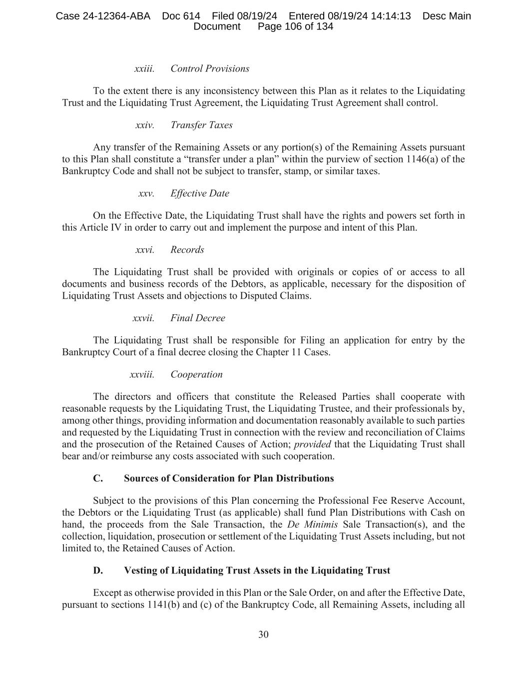 30 xxiii. Control Provisions To the extent there is any inconsistency between this Plan as it relates to the Liquidating Trust and the Liquidating Trust Agreement, the Liquidating Trust Agreement shall control. xxiv. Transfer Taxes Any transfer of the Remaining Assets or any portion(s) of the Remaining Assets pursuant to this Plan shall constitute a “transfer under a plan” within the purview of section 1146(a) of the Bankruptcy Code and shall not be subject to transfer, stamp, or similar taxes. xxv. Effective Date On the Effective Date, the Liquidating Trust shall have the rights and powers set forth in this Article IV in order to carry out and implement the purpose and intent of this Plan. xxvi. Records The Liquidating Trust shall be provided with originals or copies of or access to all documents and business records of the Debtors, as applicable, necessary for the disposition of Liquidating Trust Assets and objections to Disputed Claims. xxvii. Final Decree The Liquidating Trust shall be responsible for Filing an application for entry by the Bankruptcy Court of a final decree closing the Chapter 11 Cases. xxviii. Cooperation The directors and officers that constitute the Released Parties shall cooperate with reasonable requests by the Liquidating Trust, the Liquidating Trustee, and their professionals by, among other things, providing information and documentation reasonably available to such parties and requested by the Liquidating Trust in connection with the review and reconciliation of Claims and the prosecution of the Retained Causes of Action; provided that the Liquidating Trust shall bear and/or reimburse any costs associated with such cooperation. C. Sources of Consideration for Plan Distributions Subject to the provisions of this Plan concerning the Professional Fee Reserve Account, the Debtors or the Liquidating Trust (as applicable) shall fund Plan Distributions with Cash on hand, the proceeds from the Sale Transaction, the De Minimis Sale Transaction(s), and the collection, liquidation, prosecution or settlement of the Liquidating Trust Assets including, but not limited to, the Retained Causes of Action. D. Vesting of Liquidating Trust Assets in the Liquidating Trust Except as otherwise provided in this Plan or the Sale Order, on and after the Effective Date, pursuant to sections 1141(b) and (c) of the Bankruptcy Code, all Remaining Assets, including all Case 24-12364-ABA Doc 614 Filed 08/19/24 Entered 08/19/24 14:14:13 Desc Main Document Page 106 of 134