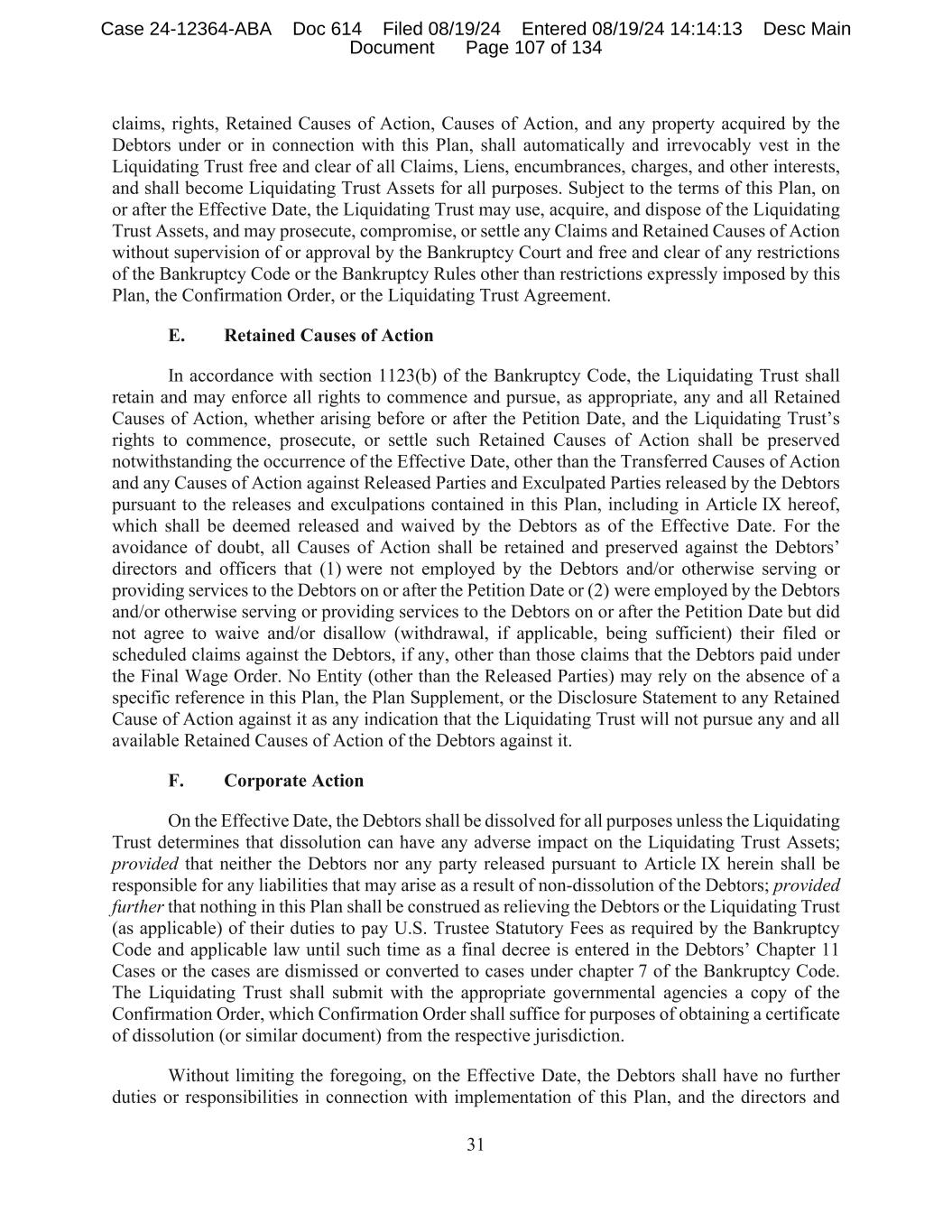 31 claims, rights, Retained Causes of Action, Causes of Action, and any property acquired by the Debtors under or in connection with this Plan, shall automatically and irrevocably vest in the Liquidating Trust free and clear of all Claims, Liens, encumbrances, charges, and other interests, and shall become Liquidating Trust Assets for all purposes. Subject to the terms of this Plan, on or after the Effective Date, the Liquidating Trust may use, acquire, and dispose of the Liquidating Trust Assets, and may prosecute, compromise, or settle any Claims and Retained Causes of Action without supervision of or approval by the Bankruptcy Court and free and clear of any restrictions of the Bankruptcy Code or the Bankruptcy Rules other than restrictions expressly imposed by this Plan, the Confirmation Order, or the Liquidating Trust Agreement. E. Retained Causes of Action In accordance with section 1123(b) of the Bankruptcy Code, the Liquidating Trust shall retain and may enforce all rights to commence and pursue, as appropriate, any and all Retained Causes of Action, whether arising before or after the Petition Date, and the Liquidating Trust’s rights to commence, prosecute, or settle such Retained Causes of Action shall be preserved notwithstanding the occurrence of the Effective Date, other than the Transferred Causes of Action and any Causes of Action against Released Parties and Exculpated Parties released by the Debtors pursuant to the releases and exculpations contained in this Plan, including in Article IX hereof, which shall be deemed released and waived by the Debtors as of the Effective Date. For the avoidance of doubt, all Causes of Action shall be retained and preserved against the Debtors’ directors and officers that (1) were not employed by the Debtors and/or otherwise serving or providing services to the Debtors on or after the Petition Date or (2) were employed by the Debtors and/or otherwise serving or providing services to the Debtors on or after the Petition Date but did not agree to waive and/or disallow (withdrawal, if applicable, being sufficient) their filed or scheduled claims against the Debtors, if any, other than those claims that the Debtors paid under the Final Wage Order. No Entity (other than the Released Parties) may rely on the absence of a specific reference in this Plan, the Plan Supplement, or the Disclosure Statement to any Retained Cause of Action against it as any indication that the Liquidating Trust will not pursue any and all available Retained Causes of Action of the Debtors against it. F. Corporate Action On the Effective Date, the Debtors shall be dissolved for all purposes unless the Liquidating Trust determines that dissolution can have any adverse impact on the Liquidating Trust Assets; provided that neither the Debtors nor any party released pursuant to Article IX herein shall be responsible for any liabilities that may arise as a result of non-dissolution of the Debtors; provided further that nothing in this Plan shall be construed as relieving the Debtors or the Liquidating Trust (as applicable) of their duties to pay U.S. Trustee Statutory Fees as required by the Bankruptcy Code and applicable law until such time as a final decree is entered in the Debtors’ Chapter 11 Cases or the cases are dismissed or converted to cases under chapter 7 of the Bankruptcy Code. The Liquidating Trust shall submit with the appropriate governmental agencies a copy of the Confirmation Order, which Confirmation Order shall suffice for purposes of obtaining a certificate of dissolution (or similar document) from the respective jurisdiction. Without limiting the foregoing, on the Effective Date, the Debtors shall have no further duties or responsibilities in connection with implementation of this Plan, and the directors and Case 24-12364-ABA Doc 614 Filed 08/19/24 Entered 08/19/24 14:14:13 Desc Main Document Page 107 of 134