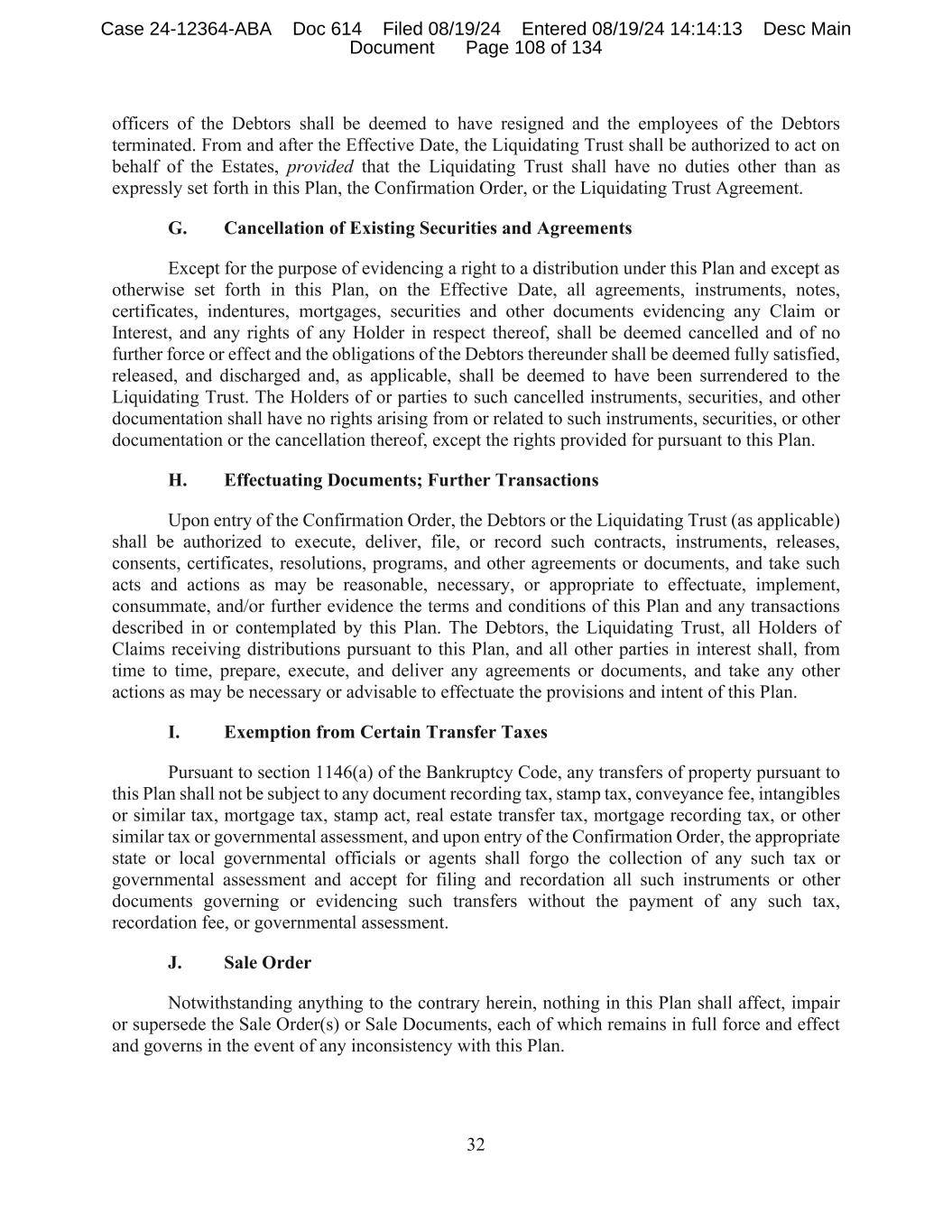 32 officers of the Debtors shall be deemed to have resigned and the employees of the Debtors terminated. From and after the Effective Date, the Liquidating Trust shall be authorized to act on behalf of the Estates, provided that the Liquidating Trust shall have no duties other than as expressly set forth in this Plan, the Confirmation Order, or the Liquidating Trust Agreement. G. Cancellation of Existing Securities and Agreements Except for the purpose of evidencing a right to a distribution under this Plan and except as otherwise set forth in this Plan, on the Effective Date, all agreements, instruments, notes, certificates, indentures, mortgages, securities and other documents evidencing any Claim or Interest, and any rights of any Holder in respect thereof, shall be deemed cancelled and of no further force or effect and the obligations of the Debtors thereunder shall be deemed fully satisfied, released, and discharged and, as applicable, shall be deemed to have been surrendered to the Liquidating Trust. The Holders of or parties to such cancelled instruments, securities, and other documentation shall have no rights arising from or related to such instruments, securities, or other documentation or the cancellation thereof, except the rights provided for pursuant to this Plan. H. Effectuating Documents; Further Transactions Upon entry of the Confirmation Order, the Debtors or the Liquidating Trust (as applicable) shall be authorized to execute, deliver, file, or record such contracts, instruments, releases, consents, certificates, resolutions, programs, and other agreements or documents, and take such acts and actions as may be reasonable, necessary, or appropriate to effectuate, implement, consummate, and/or further evidence the terms and conditions of this Plan and any transactions described in or contemplated by this Plan. The Debtors, the Liquidating Trust, all Holders of Claims receiving distributions pursuant to this Plan, and all other parties in interest shall, from time to time, prepare, execute, and deliver any agreements or documents, and take any other actions as may be necessary or advisable to effectuate the provisions and intent of this Plan. I. Exemption from Certain Transfer Taxes Pursuant to section 1146(a) of the Bankruptcy Code, any transfers of property pursuant to this Plan shall not be subject to any document recording tax, stamp tax, conveyance fee, intangibles or similar tax, mortgage tax, stamp act, real estate transfer tax, mortgage recording tax, or other similar tax or governmental assessment, and upon entry of the Confirmation Order, the appropriate state or local governmental officials or agents shall forgo the collection of any such tax or governmental assessment and accept for filing and recordation all such instruments or other documents governing or evidencing such transfers without the payment of any such tax, recordation fee, or governmental assessment. J. Sale Order Notwithstanding anything to the contrary herein, nothing in this Plan shall affect, impair or supersede the Sale Order(s) or Sale Documents, each of which remains in full force and effect and governs in the event of any inconsistency with this Plan. Case 24-12364-ABA Doc 614 Filed 08/19/24 Entered 08/19/24 14:14:13 Desc Main Document Page 108 of 134