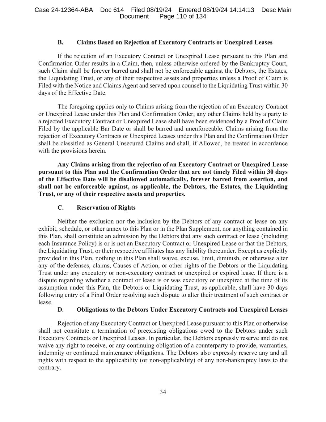 34 B. Claims Based on Rejection of Executory Contracts or Unexpired Leases If the rejection of an Executory Contract or Unexpired Lease pursuant to this Plan and Confirmation Order results in a Claim, then, unless otherwise ordered by the Bankruptcy Court, such Claim shall be forever barred and shall not be enforceable against the Debtors, the Estates, the Liquidating Trust, or any of their respective assets and properties unless a Proof of Claim is Filed with the Notice and Claims Agent and served upon counsel to the Liquidating Trust within 30 days of the Effective Date. The foregoing applies only to Claims arising from the rejection of an Executory Contract or Unexpired Lease under this Plan and Confirmation Order; any other Claims held by a party to a rejected Executory Contract or Unexpired Lease shall have been evidenced by a Proof of Claim Filed by the applicable Bar Date or shall be barred and unenforceable. Claims arising from the rejection of Executory Contracts or Unexpired Leases under this Plan and the Confirmation Order shall be classified as General Unsecured Claims and shall, if Allowed, be treated in accordance with the provisions herein. Any Claims arising from the rejection of an Executory Contract or Unexpired Lease pursuant to this Plan and the Confirmation Order that are not timely Filed within 30 days of the Effective Date will be disallowed automatically, forever barred from assertion, and shall not be enforceable against, as applicable, the Debtors, the Estates, the Liquidating Trust, or any of their respective assets and properties. C. Reservation of Rights Neither the exclusion nor the inclusion by the Debtors of any contract or lease on any exhibit, schedule, or other annex to this Plan or in the Plan Supplement, nor anything contained in this Plan, shall constitute an admission by the Debtors that any such contract or lease (including each Insurance Policy) is or is not an Executory Contract or Unexpired Lease or that the Debtors, the Liquidating Trust, or their respective affiliates has any liability thereunder. Except as explicitly provided in this Plan, nothing in this Plan shall waive, excuse, limit, diminish, or otherwise alter any of the defenses, claims, Causes of Action, or other rights of the Debtors or the Liquidating Trust under any executory or non-executory contract or unexpired or expired lease. If there is a dispute regarding whether a contract or lease is or was executory or unexpired at the time of its assumption under this Plan, the Debtors or Liquidating Trust, as applicable, shall have 30 days following entry of a Final Order resolving such dispute to alter their treatment of such contract or lease. D. Obligations to the Debtors Under Executory Contracts and Unexpired Leases Rejection of any Executory Contract or Unexpired Lease pursuant to this Plan or otherwise shall not constitute a termination of preexisting obligations owed to the Debtors under such Executory Contracts or Unexpired Leases. In particular, the Debtors expressly reserve and do not waive any right to receive, or any continuing obligation of a counterparty to provide, warranties, indemnity or continued maintenance obligations. The Debtors also expressly reserve any and all rights with respect to the applicability (or non-applicability) of any non-bankruptcy laws to the contrary. Case 24-12364-ABA Doc 614 Filed 08/19/24 Entered 08/19/24 14:14:13 Desc Main Document Page 110 of 134