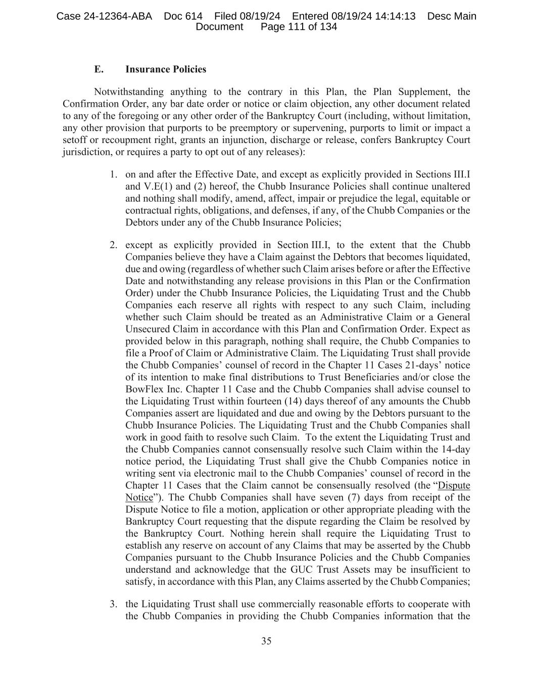 35 E. Insurance Policies Notwithstanding anything to the contrary in this Plan, the Plan Supplement, the Confirmation Order, any bar date order or notice or claim objection, any other document related to any of the foregoing or any other order of the Bankruptcy Court (including, without limitation, any other provision that purports to be preemptory or supervening, purports to limit or impact a setoff or recoupment right, grants an injunction, discharge or release, confers Bankruptcy Court jurisdiction, or requires a party to opt out of any releases): 1. on and after the Effective Date, and except as explicitly provided in Sections III.I and V.E(1) and (2) hereof, the Chubb Insurance Policies shall continue unaltered and nothing shall modify, amend, affect, impair or prejudice the legal, equitable or contractual rights, obligations, and defenses, if any, of the Chubb Companies or the Debtors under any of the Chubb Insurance Policies; 2. except as explicitly provided in Section III.I, to the extent that the Chubb Companies believe they have a Claim against the Debtors that becomes liquidated, due and owing (regardless of whether such Claim arises before or after the Effective Date and notwithstanding any release provisions in this Plan or the Confirmation Order) under the Chubb Insurance Policies, the Liquidating Trust and the Chubb Companies each reserve all rights with respect to any such Claim, including whether such Claim should be treated as an Administrative Claim or a General Unsecured Claim in accordance with this Plan and Confirmation Order. Expect as provided below in this paragraph, nothing shall require, the Chubb Companies to file a Proof of Claim or Administrative Claim. The Liquidating Trust shall provide the Chubb Companies’ counsel of record in the Chapter 11 Cases 21-days’ notice of its intention to make final distributions to Trust Beneficiaries and/or close the BowFlex Inc. Chapter 11 Case and the Chubb Companies shall advise counsel to the Liquidating Trust within fourteen (14) days thereof of any amounts the Chubb Companies assert are liquidated and due and owing by the Debtors pursuant to the Chubb Insurance Policies. The Liquidating Trust and the Chubb Companies shall work in good faith to resolve such Claim. To the extent the Liquidating Trust and the Chubb Companies cannot consensually resolve such Claim within the 14-day notice period, the Liquidating Trust shall give the Chubb Companies notice in writing sent via electronic mail to the Chubb Companies’ counsel of record in the Chapter 11 Cases that the Claim cannot be consensually resolved (the “Dispute Notice”). The Chubb Companies shall have seven (7) days from receipt of the Dispute Notice to file a motion, application or other appropriate pleading with the Bankruptcy Court requesting that the dispute regarding the Claim be resolved by the Bankruptcy Court. Nothing herein shall require the Liquidating Trust to establish any reserve on account of any Claims that may be asserted by the Chubb Companies pursuant to the Chubb Insurance Policies and the Chubb Companies understand and acknowledge that the GUC Trust Assets may be insufficient to satisfy, in accordance with this Plan, any Claims asserted by the Chubb Companies; 3. the Liquidating Trust shall use commercially reasonable efforts to cooperate with the Chubb Companies in providing the Chubb Companies information that the Case 24-12364-ABA Doc 614 Filed 08/19/24 Entered 08/19/24 14:14:13 Desc Main Document Page 111 of 134