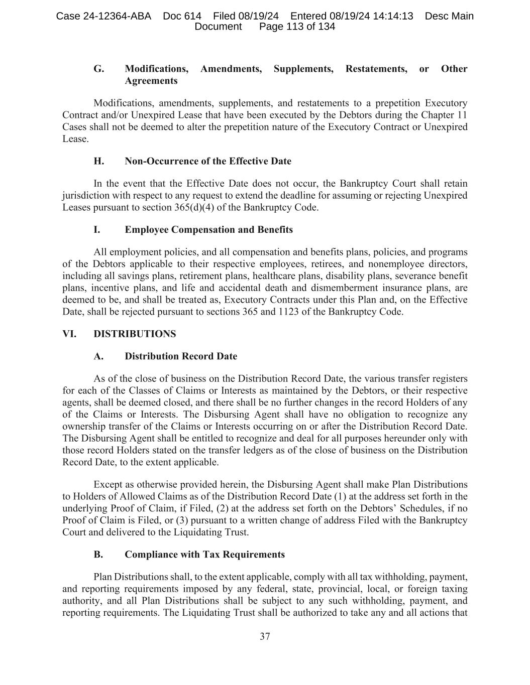 37 G. Modifications, Amendments, Supplements, Restatements, or Other Agreements Modifications, amendments, supplements, and restatements to a prepetition Executory Contract and/or Unexpired Lease that have been executed by the Debtors during the Chapter 11 Cases shall not be deemed to alter the prepetition nature of the Executory Contract or Unexpired Lease. H. Non-Occurrence of the Effective Date In the event that the Effective Date does not occur, the Bankruptcy Court shall retain jurisdiction with respect to any request to extend the deadline for assuming or rejecting Unexpired Leases pursuant to section 365(d)(4) of the Bankruptcy Code. I. Employee Compensation and Benefits All employment policies, and all compensation and benefits plans, policies, and programs of the Debtors applicable to their respective employees, retirees, and nonemployee directors, including all savings plans, retirement plans, healthcare plans, disability plans, severance benefit plans, incentive plans, and life and accidental death and dismemberment insurance plans, are deemed to be, and shall be treated as, Executory Contracts under this Plan and, on the Effective Date, shall be rejected pursuant to sections 365 and 1123 of the Bankruptcy Code. VI. DISTRIBUTIONS A. Distribution Record Date As of the close of business on the Distribution Record Date, the various transfer registers for each of the Classes of Claims or Interests as maintained by the Debtors, or their respective agents, shall be deemed closed, and there shall be no further changes in the record Holders of any of the Claims or Interests. The Disbursing Agent shall have no obligation to recognize any ownership transfer of the Claims or Interests occurring on or after the Distribution Record Date. The Disbursing Agent shall be entitled to recognize and deal for all purposes hereunder only with those record Holders stated on the transfer ledgers as of the close of business on the Distribution Record Date, to the extent applicable. Except as otherwise provided herein, the Disbursing Agent shall make Plan Distributions to Holders of Allowed Claims as of the Distribution Record Date (1) at the address set forth in the underlying Proof of Claim, if Filed, (2) at the address set forth on the Debtors’ Schedules, if no Proof of Claim is Filed, or (3) pursuant to a written change of address Filed with the Bankruptcy Court and delivered to the Liquidating Trust. B. Compliance with Tax Requirements Plan Distributions shall, to the extent applicable, comply with all tax withholding, payment, and reporting requirements imposed by any federal, state, provincial, local, or foreign taxing authority, and all Plan Distributions shall be subject to any such withholding, payment, and reporting requirements. The Liquidating Trust shall be authorized to take any and all actions that Case 24-12364-ABA Doc 614 Filed 08/19/24 Entered 08/19/24 14:14:13 Desc Main Document Page 113 of 134