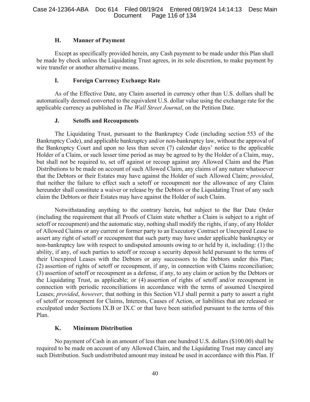 40 H. Manner of Payment Except as specifically provided herein, any Cash payment to be made under this Plan shall be made by check unless the Liquidating Trust agrees, in its sole discretion, to make payment by wire transfer or another alternative means. I. Foreign Currency Exchange Rate As of the Effective Date, any Claim asserted in currency other than U.S. dollars shall be automatically deemed converted to the equivalent U.S. dollar value using the exchange rate for the applicable currency as published in The Wall Street Journal, on the Petition Date. J. Setoffs and Recoupments The Liquidating Trust, pursuant to the Bankruptcy Code (including section 553 of the Bankruptcy Code), and applicable bankruptcy and/or non-bankruptcy law, without the approval of the Bankruptcy Court and upon no less than seven (7) calendar days’ notice to the applicable Holder of a Claim, or such lesser time period as may be agreed to by the Holder of a Claim, may, but shall not be required to, set off against or recoup against any Allowed Claim and the Plan Distributions to be made on account of such Allowed Claim, any claims of any nature whatsoever that the Debtors or their Estates may have against the Holder of such Allowed Claim; provided, that neither the failure to effect such a setoff or recoupment nor the allowance of any Claim hereunder shall constitute a waiver or release by the Debtors or the Liquidating Trust of any such claim the Debtors or their Estates may have against the Holder of such Claim. Notwithstanding anything to the contrary herein, but subject to the Bar Date Order (including the requirement that all Proofs of Claim state whether a Claim is subject to a right of setoff or recoupment) and the automatic stay, nothing shall modify the rights, if any, of any Holder of Allowed Claims or any current or former party to an Executory Contract or Unexpired Lease to assert any right of setoff or recoupment that such party may have under applicable bankruptcy or non-bankruptcy law with respect to undisputed amounts owing to or held by it, including: (1) the ability, if any, of such parties to setoff or recoup a security deposit held pursuant to the terms of their Unexpired Leases with the Debtors or any successors to the Debtors under this Plan; (2) assertion of rights of setoff or recoupment, if any, in connection with Claims reconciliation; (3) assertion of setoff or recoupment as a defense, if any, to any claim or action by the Debtors or the Liquidating Trust, as applicable; or (4) assertion of rights of setoff and/or recoupment in connection with periodic reconciliations in accordance with the terms of assumed Unexpired Leases; provided, however, that nothing in this Section VI.J shall permit a party to assert a right of setoff or recoupment for Claims, Interests, Causes of Action, or liabilities that are released or exculpated under Sections IX.B or IX.C or that have been satisfied pursuant to the terms of this Plan. K. Minimum Distribution No payment of Cash in an amount of less than one hundred U.S. dollars ($100.00) shall be required to be made on account of any Allowed Claim, and the Liquidating Trust may cancel any such Distribution. Such undistributed amount may instead be used in accordance with this Plan. If Case 24-12364-ABA Doc 614 Filed 08/19/24 Entered 08/19/24 14:14:13 Desc Main Document Page 116 of 134