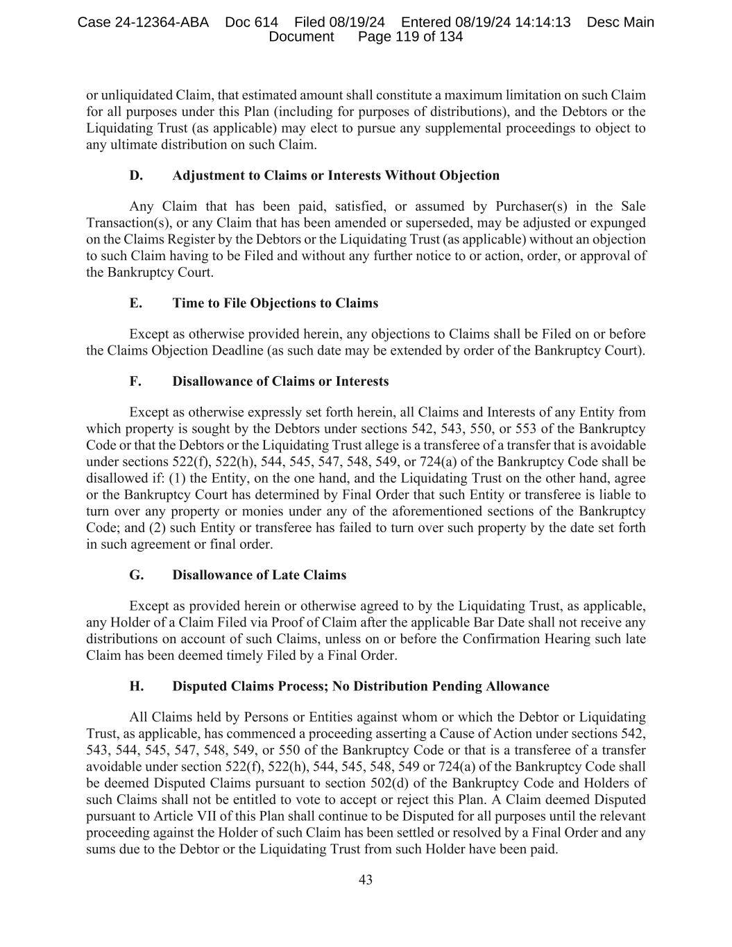 43 or unliquidated Claim, that estimated amount shall constitute a maximum limitation on such Claim for all purposes under this Plan (including for purposes of distributions), and the Debtors or the Liquidating Trust (as applicable) may elect to pursue any supplemental proceedings to object to any ultimate distribution on such Claim. D. Adjustment to Claims or Interests Without Objection Any Claim that has been paid, satisfied, or assumed by Purchaser(s) in the Sale Transaction(s), or any Claim that has been amended or superseded, may be adjusted or expunged on the Claims Register by the Debtors or the Liquidating Trust (as applicable) without an objection to such Claim having to be Filed and without any further notice to or action, order, or approval of the Bankruptcy Court. E. Time to File Objections to Claims Except as otherwise provided herein, any objections to Claims shall be Filed on or before the Claims Objection Deadline (as such date may be extended by order of the Bankruptcy Court). F. Disallowance of Claims or Interests Except as otherwise expressly set forth herein, all Claims and Interests of any Entity from which property is sought by the Debtors under sections 542, 543, 550, or 553 of the Bankruptcy Code or that the Debtors or the Liquidating Trust allege is a transferee of a transfer that is avoidable under sections 522(f), 522(h), 544, 545, 547, 548, 549, or 724(a) of the Bankruptcy Code shall be disallowed if: (1) the Entity, on the one hand, and the Liquidating Trust on the other hand, agree or the Bankruptcy Court has determined by Final Order that such Entity or transferee is liable to turn over any property or monies under any of the aforementioned sections of the Bankruptcy Code; and (2) such Entity or transferee has failed to turn over such property by the date set forth in such agreement or final order. G. Disallowance of Late Claims Except as provided herein or otherwise agreed to by the Liquidating Trust, as applicable, any Holder of a Claim Filed via Proof of Claim after the applicable Bar Date shall not receive any distributions on account of such Claims, unless on or before the Confirmation Hearing such late Claim has been deemed timely Filed by a Final Order. H. Disputed Claims Process; No Distribution Pending Allowance All Claims held by Persons or Entities against whom or which the Debtor or Liquidating Trust, as applicable, has commenced a proceeding asserting a Cause of Action under sections 542, 543, 544, 545, 547, 548, 549, or 550 of the Bankruptcy Code or that is a transferee of a transfer avoidable under section 522(f), 522(h), 544, 545, 548, 549 or 724(a) of the Bankruptcy Code shall be deemed Disputed Claims pursuant to section 502(d) of the Bankruptcy Code and Holders of such Claims shall not be entitled to vote to accept or reject this Plan. A Claim deemed Disputed pursuant to Article VII of this Plan shall continue to be Disputed for all purposes until the relevant proceeding against the Holder of such Claim has been settled or resolved by a Final Order and any sums due to the Debtor or the Liquidating Trust from such Holder have been paid. Case 24-12364-ABA Doc 614 Filed 08/19/24 Entered 08/19/24 14:14:13 Desc Main Document Page 119 of 134