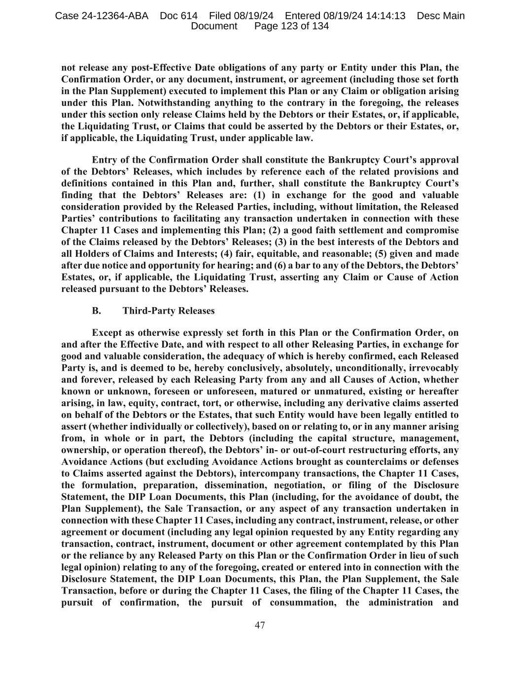 47 not release any post-Effective Date obligations of any party or Entity under this Plan, the Confirmation Order, or any document, instrument, or agreement (including those set forth in the Plan Supplement) executed to implement this Plan or any Claim or obligation arising under this Plan. Notwithstanding anything to the contrary in the foregoing, the releases under this section only release Claims held by the Debtors or their Estates, or, if applicable, the Liquidating Trust, or Claims that could be asserted by the Debtors or their Estates, or, if applicable, the Liquidating Trust, under applicable law. Entry of the Confirmation Order shall constitute the Bankruptcy Court’s approval of the Debtors’ Releases, which includes by reference each of the related provisions and definitions contained in this Plan and, further, shall constitute the Bankruptcy Court’s finding that the Debtors’ Releases are: (1) in exchange for the good and valuable consideration provided by the Released Parties, including, without limitation, the Released Parties’ contributions to facilitating any transaction undertaken in connection with these Chapter 11 Cases and implementing this Plan; (2) a good faith settlement and compromise of the Claims released by the Debtors’ Releases; (3) in the best interests of the Debtors and all Holders of Claims and Interests; (4) fair, equitable, and reasonable; (5) given and made after due notice and opportunity for hearing; and (6) a bar to any of the Debtors, the Debtors’ Estates, or, if applicable, the Liquidating Trust, asserting any Claim or Cause of Action released pursuant to the Debtors’ Releases. B. Third-Party Releases Except as otherwise expressly set forth in this Plan or the Confirmation Order, on and after the Effective Date, and with respect to all other Releasing Parties, in exchange for good and valuable consideration, the adequacy of which is hereby confirmed, each Released Party is, and is deemed to be, hereby conclusively, absolutely, unconditionally, irrevocably and forever, released by each Releasing Party from any and all Causes of Action, whether known or unknown, foreseen or unforeseen, matured or unmatured, existing or hereafter arising, in law, equity, contract, tort, or otherwise, including any derivative claims asserted on behalf of the Debtors or the Estates, that such Entity would have been legally entitled to assert (whether individually or collectively), based on or relating to, or in any manner arising from, in whole or in part, the Debtors (including the capital structure, management, ownership, or operation thereof), the Debtors’ in- or out-of-court restructuring efforts, any Avoidance Actions (but excluding Avoidance Actions brought as counterclaims or defenses to Claims asserted against the Debtors), intercompany transactions, the Chapter 11 Cases, the formulation, preparation, dissemination, negotiation, or filing of the Disclosure Statement, the DIP Loan Documents, this Plan (including, for the avoidance of doubt, the Plan Supplement), the Sale Transaction, or any aspect of any transaction undertaken in connection with these Chapter 11 Cases, including any contract, instrument, release, or other agreement or document (including any legal opinion requested by any Entity regarding any transaction, contract, instrument, document or other agreement contemplated by this Plan or the reliance by any Released Party on this Plan or the Confirmation Order in lieu of such legal opinion) relating to any of the foregoing, created or entered into in connection with the Disclosure Statement, the DIP Loan Documents, this Plan, the Plan Supplement, the Sale Transaction, before or during the Chapter 11 Cases, the filing of the Chapter 11 Cases, the pursuit of confirmation, the pursuit of consummation, the administration and Case 24-12364-ABA Doc 614 Filed 08/19/24 Entered 08/19/24 14:14:13 Desc Main Document Page 123 of 134