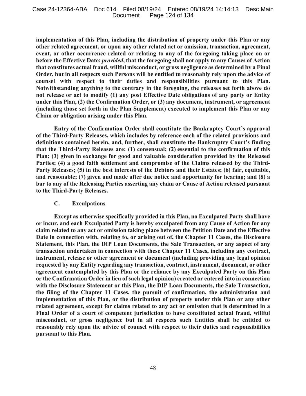 48 implementation of this Plan, including the distribution of property under this Plan or any other related agreement, or upon any other related act or omission, transaction, agreement, event, or other occurrence related or relating to any of the foregoing taking place on or before the Effective Date; provided, that the foregoing shall not apply to any Causes of Action that constitutes actual fraud, willful misconduct, or gross negligence as determined by a Final Order, but in all respects such Persons will be entitled to reasonably rely upon the advice of counsel with respect to their duties and responsibilities pursuant to this Plan. Notwithstanding anything to the contrary in the foregoing, the releases set forth above do not release or act to modify (1) any post Effective Date obligations of any party or Entity under this Plan, (2) the Confirmation Order, or (3) any document, instrument, or agreement (including those set forth in the Plan Supplement) executed to implement this Plan or any Claim or obligation arising under this Plan. Entry of the Confirmation Order shall constitute the Bankruptcy Court’s approval of the Third-Party Releases, which includes by reference each of the related provisions and definitions contained herein, and, further, shall constitute the Bankruptcy Court’s finding that the Third-Party Releases are: (1) consensual; (2) essential to the confirmation of this Plan; (3) given in exchange for good and valuable consideration provided by the Released Parties; (4) a good faith settlement and compromise of the Claims released by the Third- Party Releases; (5) in the best interests of the Debtors and their Estates; (6) fair, equitable, and reasonable; (7) given and made after due notice and opportunity for hearing; and (8) a bar to any of the Releasing Parties asserting any claim or Cause of Action released pursuant to the Third-Party Releases. C. Exculpations Except as otherwise specifically provided in this Plan, no Exculpated Party shall have or incur, and each Exculpated Party is hereby exculpated from any Cause of Action for any claim related to any act or omission taking place between the Petition Date and the Effective Date in connection with, relating to, or arising out of, the Chapter 11 Cases, the Disclosure Statement, this Plan, the DIP Loan Documents, the Sale Transaction, or any aspect of any transaction undertaken in connection with these Chapter 11 Cases, including any contract, instrument, release or other agreement or document (including providing any legal opinion requested by any Entity regarding any transaction, contract, instrument, document, or other agreement contemplated by this Plan or the reliance by any Exculpated Party on this Plan or the Confirmation Order in lieu of such legal opinion) created or entered into in connection with the Disclosure Statement or this Plan, the DIP Loan Documents, the Sale Transaction, the filing of the Chapter 11 Cases, the pursuit of confirmation, the administration and implementation of this Plan, or the distribution of property under this Plan or any other related agreement, except for claims related to any act or omission that is determined in a Final Order of a court of competent jurisdiction to have constituted actual fraud, willful misconduct, or gross negligence but in all respects such Entities shall be entitled to reasonably rely upon the advice of counsel with respect to their duties and responsibilities pursuant to this Plan. Case 24-12364-ABA Doc 614 Filed 08/19/24 Entered 08/19/24 14:14:13 Desc Main Document Page 124 of 134