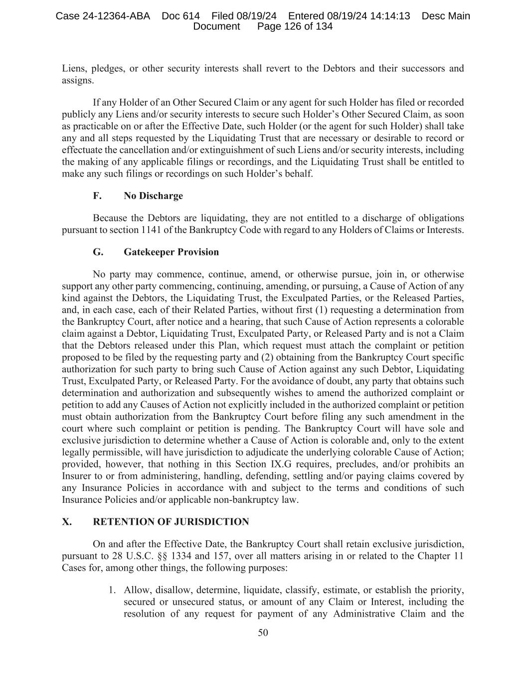 50 Liens, pledges, or other security interests shall revert to the Debtors and their successors and assigns. If any Holder of an Other Secured Claim or any agent for such Holder has filed or recorded publicly any Liens and/or security interests to secure such Holder’s Other Secured Claim, as soon as practicable on or after the Effective Date, such Holder (or the agent for such Holder) shall take any and all steps requested by the Liquidating Trust that are necessary or desirable to record or effectuate the cancellation and/or extinguishment of such Liens and/or security interests, including the making of any applicable filings or recordings, and the Liquidating Trust shall be entitled to make any such filings or recordings on such Holder’s behalf. F. No Discharge Because the Debtors are liquidating, they are not entitled to a discharge of obligations pursuant to section 1141 of the Bankruptcy Code with regard to any Holders of Claims or Interests. G. Gatekeeper Provision No party may commence, continue, amend, or otherwise pursue, join in, or otherwise support any other party commencing, continuing, amending, or pursuing, a Cause of Action of any kind against the Debtors, the Liquidating Trust, the Exculpated Parties, or the Released Parties, and, in each case, each of their Related Parties, without first (1) requesting a determination from the Bankruptcy Court, after notice and a hearing, that such Cause of Action represents a colorable claim against a Debtor, Liquidating Trust, Exculpated Party, or Released Party and is not a Claim that the Debtors released under this Plan, which request must attach the complaint or petition proposed to be filed by the requesting party and (2) obtaining from the Bankruptcy Court specific authorization for such party to bring such Cause of Action against any such Debtor, Liquidating Trust, Exculpated Party, or Released Party. For the avoidance of doubt, any party that obtains such determination and authorization and subsequently wishes to amend the authorized complaint or petition to add any Causes of Action not explicitly included in the authorized complaint or petition must obtain authorization from the Bankruptcy Court before filing any such amendment in the court where such complaint or petition is pending. The Bankruptcy Court will have sole and exclusive jurisdiction to determine whether a Cause of Action is colorable and, only to the extent legally permissible, will have jurisdiction to adjudicate the underlying colorable Cause of Action; provided, however, that nothing in this Section IX.G requires, precludes, and/or prohibits an Insurer to or from administering, handling, defending, settling and/or paying claims covered by any Insurance Policies in accordance with and subject to the terms and conditions of such Insurance Policies and/or applicable non-bankruptcy law. X. RETENTION OF JURISDICTION On and after the Effective Date, the Bankruptcy Court shall retain exclusive jurisdiction, pursuant to 28 U.S.C. §§ 1334 and 157, over all matters arising in or related to the Chapter 11 Cases for, among other things, the following purposes: 1. Allow, disallow, determine, liquidate, classify, estimate, or establish the priority, secured or unsecured status, or amount of any Claim or Interest, including the resolution of any request for payment of any Administrative Claim and the Case 24-12364-ABA Doc 614 Filed 08/19/24 Entered 08/19/24 14:14:13 Desc Main Document Page 126 of 134