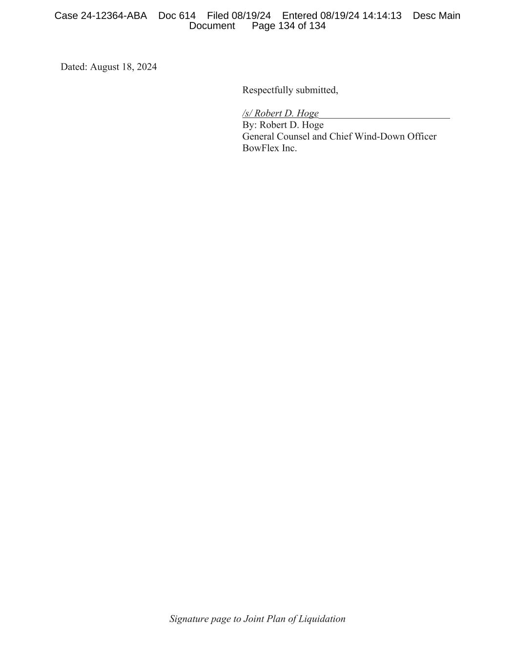 Signature page to Joint Plan of Liquidation Dated: August 18, 2024 Respectfully submitted, /s/ Robert D. Hoge__________________________ By: Robert D. Hoge General Counsel and Chief Wind-Down Officer BowFlex Inc. Case 24-12364-ABA Doc 614 Filed 08/19/24 Entered 08/19/24 14:14:13 Desc Main Document Page 134 of 134