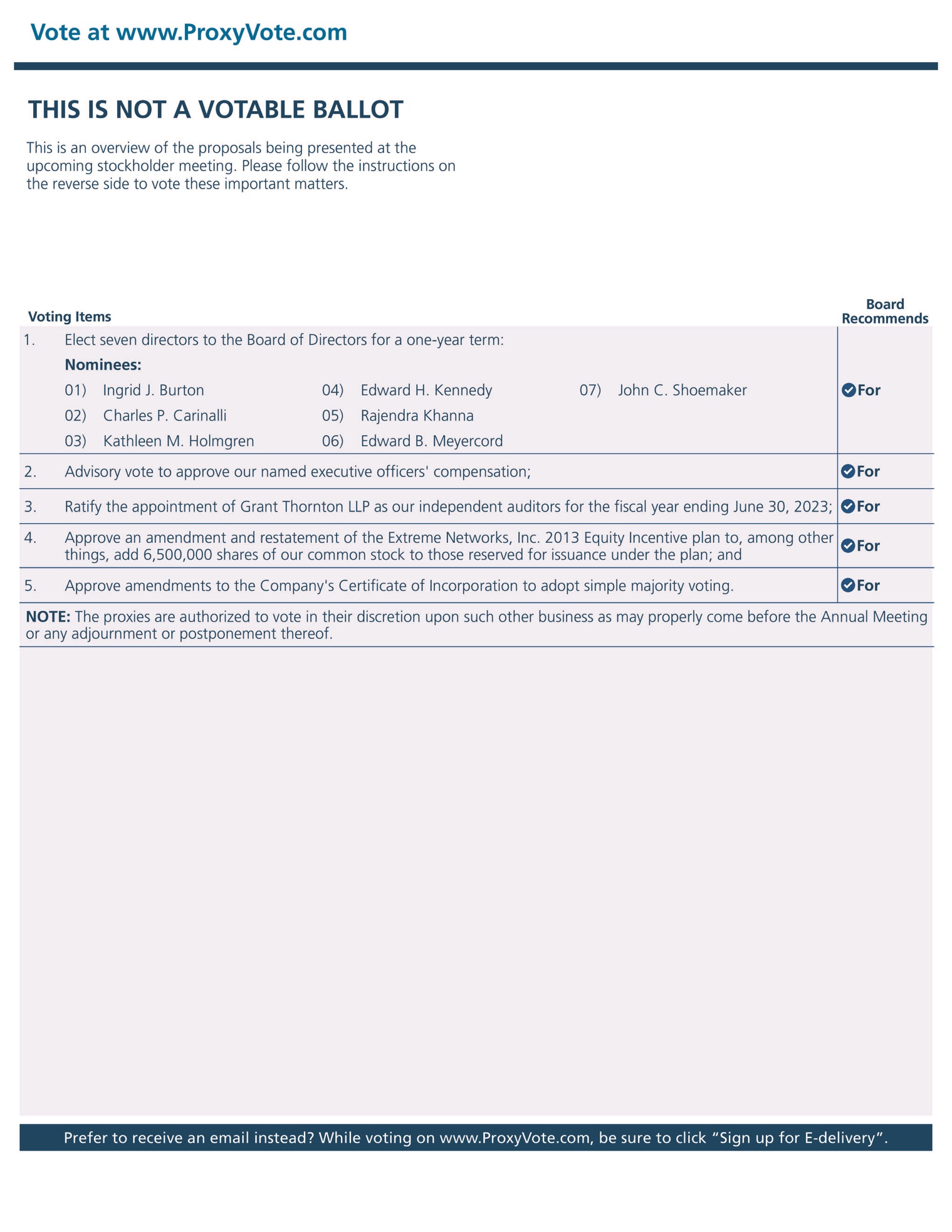 02) Charles P. Carinalli 05) Rajendra Khanna 03) Kathleen M. Holmgren 06) Edward B. Meyercord 0For 2. Advisory vote to approve our named executive officers' compensation; 0For 3. Ratify the appointment of Grant Thornton LLP as our independent auditors for the fiscal year ending June 30, 2023; 0For 4. Approve an amendment and restatement of the Extreme Networks, Inc. 2013 Equity Incentive plan to, among other