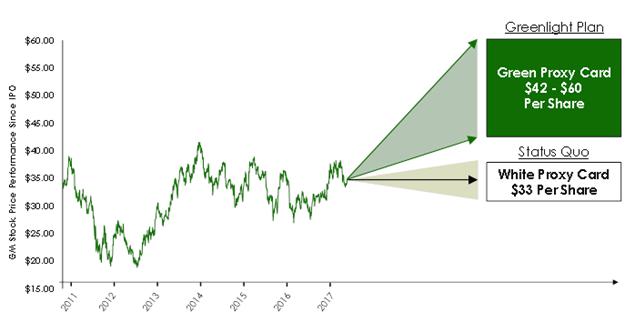 Greenlight urges all GM shareholders to vote the GREEN proxy card in favor of the Plan and in support of Greenlight’s three highly qualified Director nominees – Leo Hindery, Jr., Vinit Sethi, and William N. Thorndike, Jr. – who will bring desperately needed fresh thinking and new perspectives to the Board, at GM’s Annual Meeting of Shareholders, scheduled to take place on June 6, 2017.