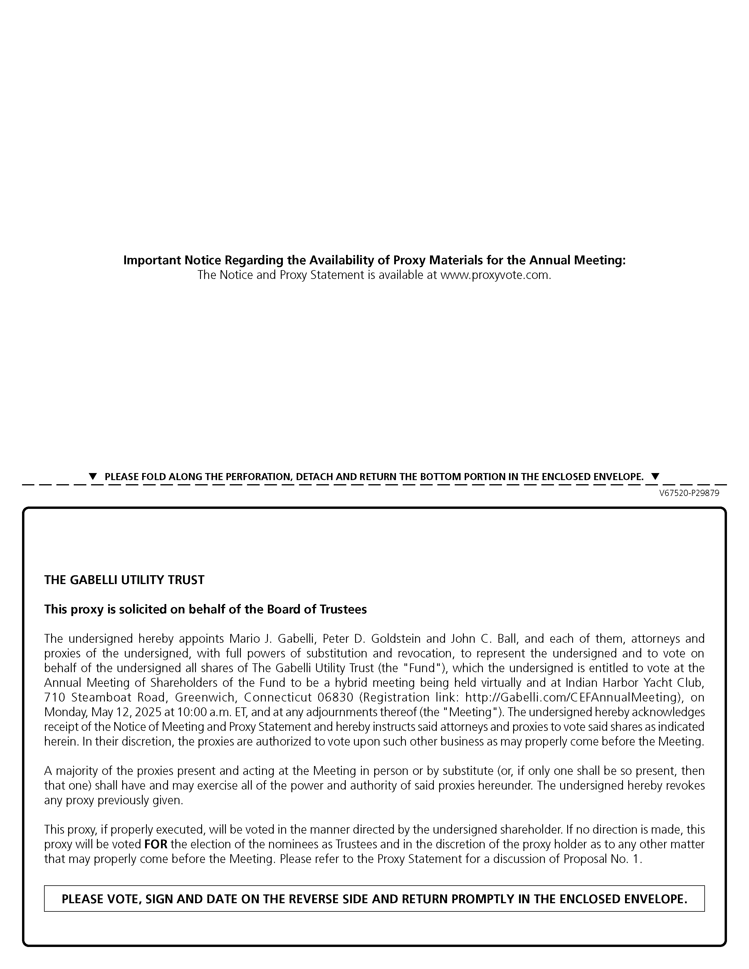This Proxy Statement is furnished in connection with the solicitation of proxies by the Board of Trustees (the “Board,” the members of which are referred to as “Trustees”) of The Gabelli Utility Trust, a Delaware statutory trust (the “Fund”), for use at the Annual Meeting of Shareholders of the Fund to be held on Monday, May 12, 2025, at 10:00 a.m., ET, at Indian Harbor Yacht Club, 710 Steamboat Road, Greenwich, Connecticut, 06830 and virtually by Internet webcast (the “Meeting”), and at any adjournments or postponements thereof. A Notice of Internet Availability of Proxy Materials will first be mailed to shareholders on or about April 2, 2025.