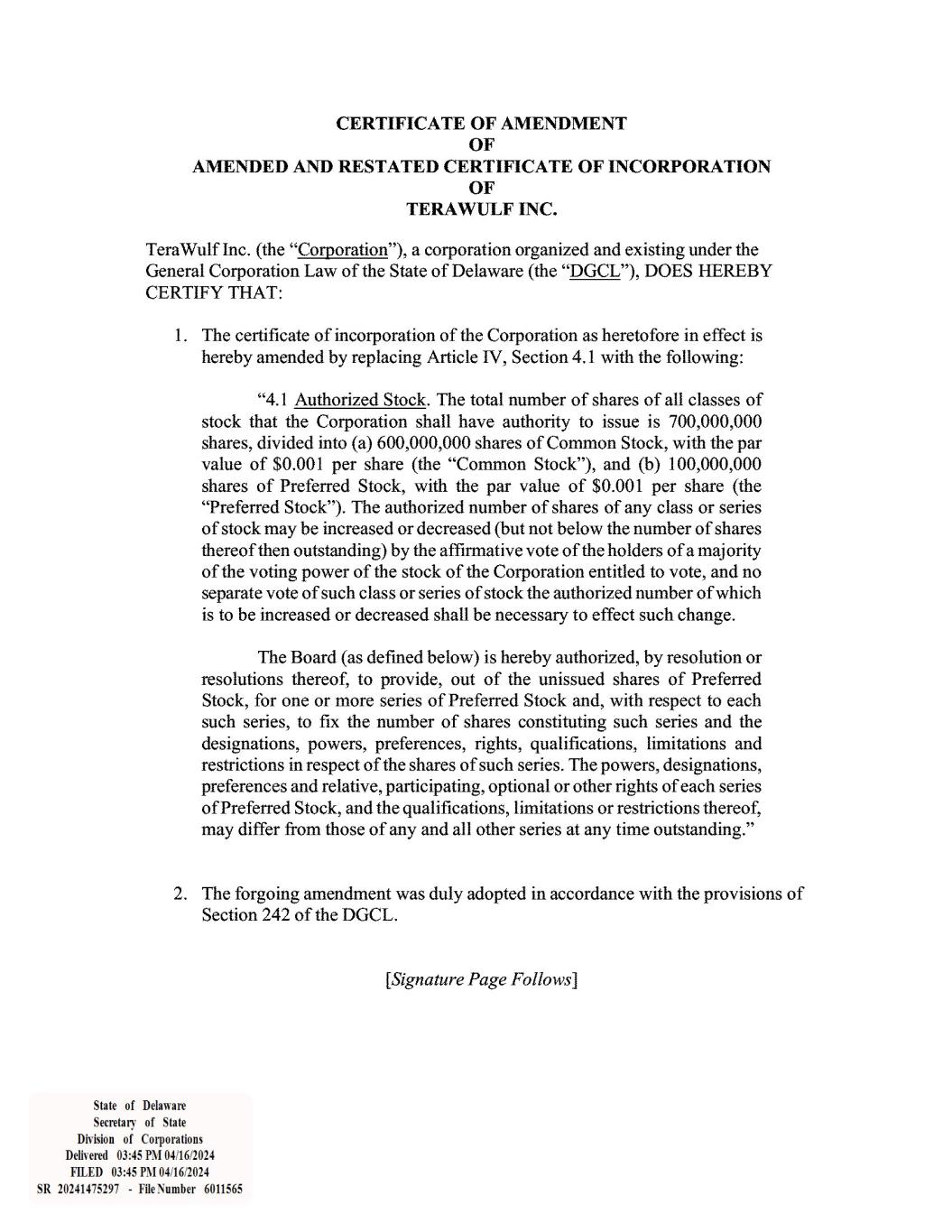 Delaware The First State Page 1 6011565 8100 Authentication: 203263353 SR# 20241475297 Date: 04-16-24 You may verify this certificate online at corp.delaware.gov/authver.shtml I, JEFFREY W. BULLOCK, SECRETARY OF STATE OF THE STATE OF DELAWARE, DO HEREBY CERTIFY THE ATTACHED IS A TRUE AND CORRECT COPY OF THE CERTIFICATE OF AMENDMENT OF “TERAWULF INC.”, FILED IN THIS OFFICE ON THE SIXTEENTH DAY OF APRIL, A.D. 2024, AT 3:45 O`CLOCK P.M.