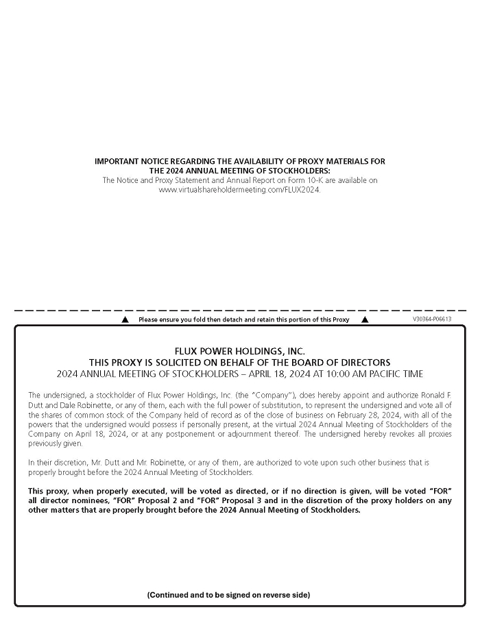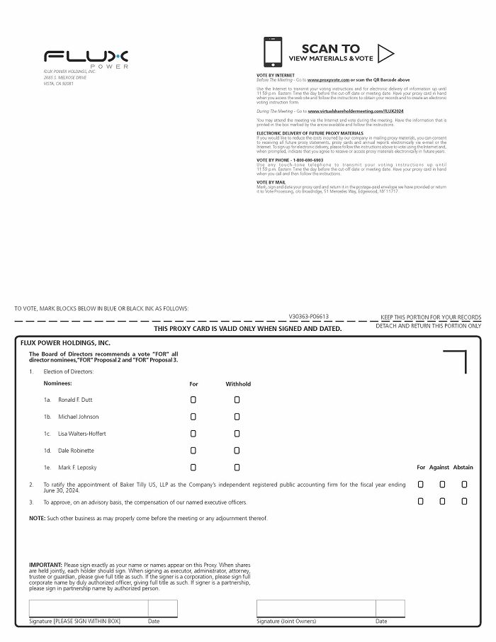 You are cordially invited to attend the Annual Meeting of Stockholders of Flux Power Holdings, Inc., or Annual Meeting. We will be conducting the 2024 Annual Meeting as a virtual meeting. The virtual meeting format will allow for greater participation by all of our stockholders, regardless of their geographic location. The Annual Meeting will be held at 10:00 a.m. Pacific Standard Time, on Thursday, April 18, 2024 via a live webcast on the internet.