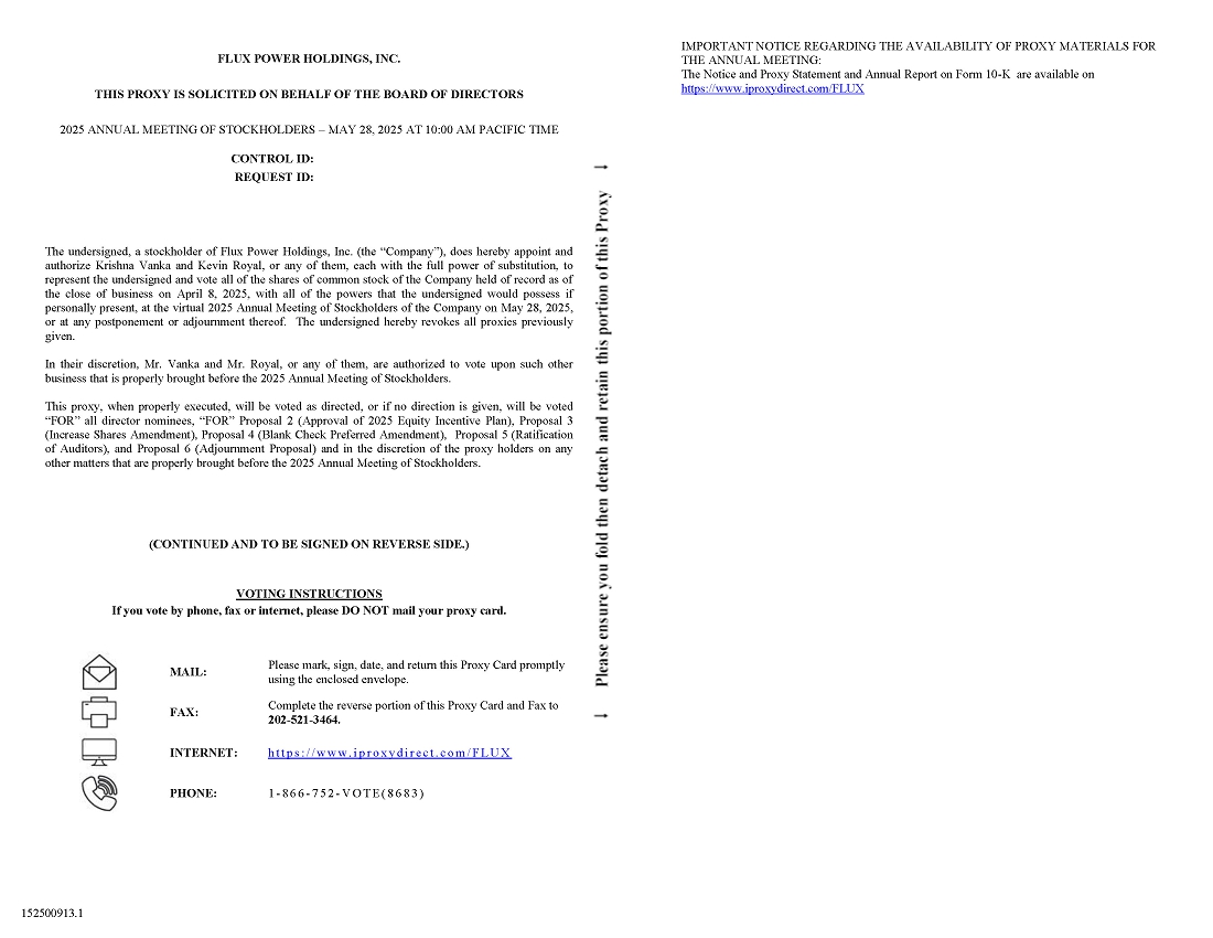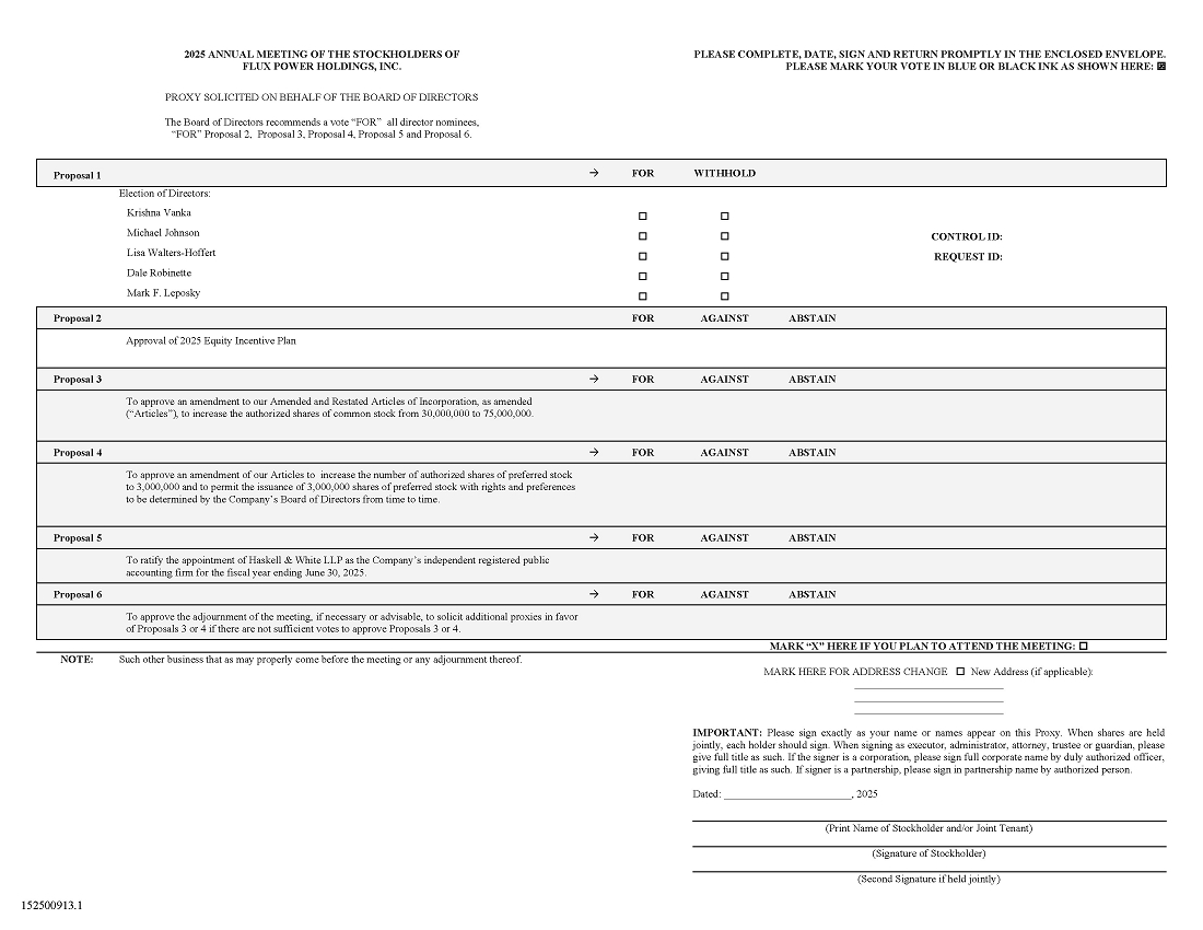 You are cordially invited to attend the Annual Meeting of Stockholders of Flux Power Holdings, Inc., or Annual Meeting. We will be conducting the 2025 Annual Meeting as a virtual meeting. The virtual meeting format will allow for greater participation by all of our stockholders, regardless of their geographic location. The Annual Meeting will be held at 10:00 a.m. Pacific Standard Time, on Wednesday, May 28, 2025 via a live webcast on the internet.