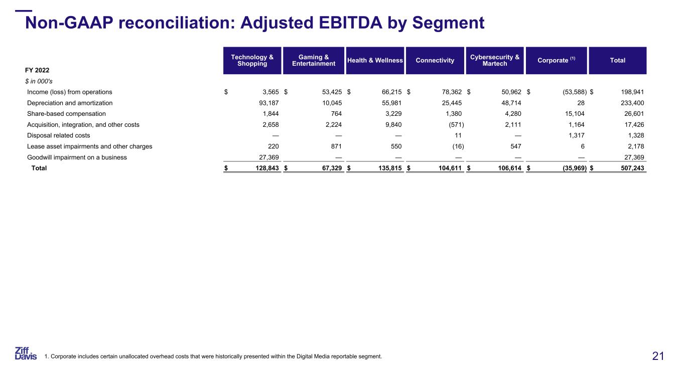 20 FY 2024 Technology & Shopping Gaming & Entertainment Health & Wellness Connectivity Cybersecurity & Martech Corporate (1) Total $ in 000's Income (loss) from operations $ (71,072) $ 54,001 $ 67,207 $ 79,374 $ 54,961 $ (70,823) $ 113,648 Depreciation and amortization 83,424 10,733 52,766 31,882 33,025 86 211,916 Share-based compensation 5,014 1,070 5,604 2,658 4,631 21,938 40,915 Acquisition, integration, and other costs 18,554 2,727 9,788 (3,823) 5,395 7,553 40,194 Disposal related costs (24) — — — 20 205 201 Lease asset impairments and other charges 223 93 15 — 756 274 1,361 Goodwill impairment on a business 85,273 — — — — — 85,273 Total $ 121,392 $ 68,624 $ 135,380 $ 110,091 $ 98,788 $ (40,767) $ 493,508 Non-GAAP reconciliation: Adjusted EBITDA by Segment FY 2023 Technology & Shopping Gaming & Entertainment Health & Wellness Connectivity Cybersecurity & Martech Corporate (1) Total $ in 000's Income (loss) from operations $ (50,498) $ 57,299 $ 63,575 $ 70,591 $ 43,210 $ (51,566) $ 132,611 Income from equity method investment, net — — — — — (1,500) (1,500) Depreciation and amortization 83,271 10,368 59,870 31,793 52,618 (954) 236,966 Share-based compensation 4,941 758 4,843 2,014 4,186 15,178 31,920 Acquisition, integration, and other costs 4,452 2,441 10,004 2,820 887 396 21,000 Disposal related costs 633 — — — 202 1,382 2,217 Lease asset impairments and other charges 1,019 — 510 — 471 245 2,245 Goodwill impairment on a business 56,850 — — — — — 56,850 Total $ 100,668 $ 70,866 $ 138,802 $ 107,218 $ 101,574 $ (36,819) $ 482,309 1. Corporate includes certain unallocated overhead costs that were historically presented within the Digital Media reportable segment.