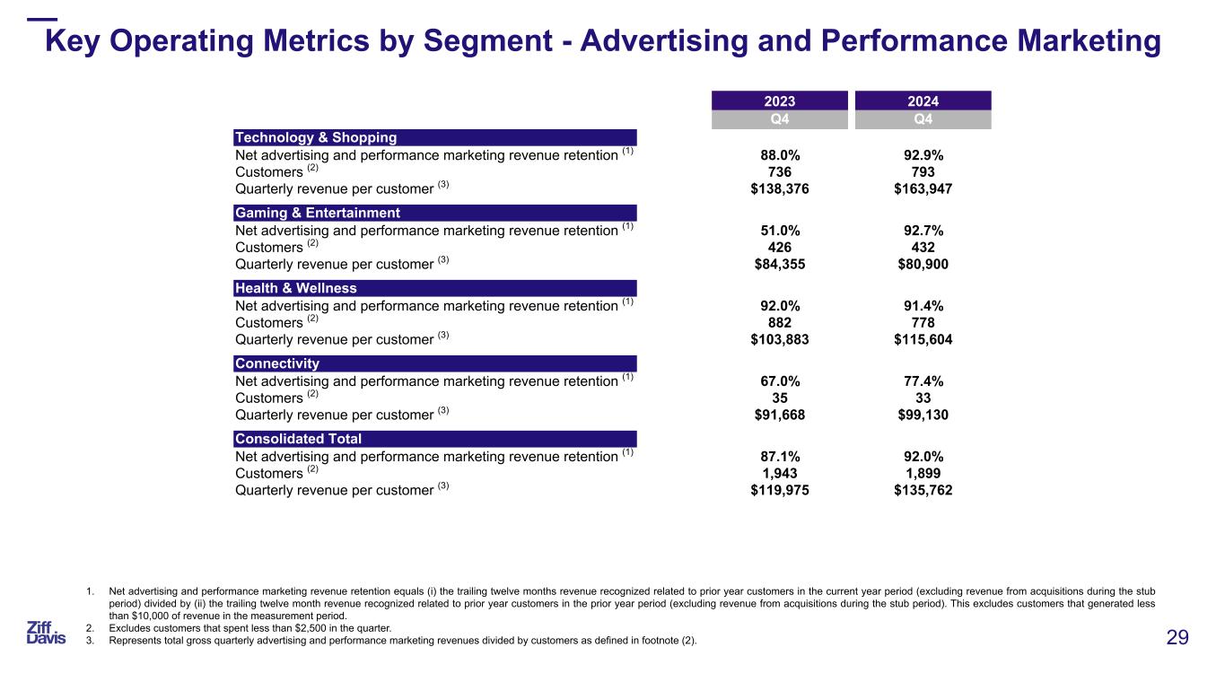 29 2023 2024 Q4 Q4 Technology & Shopping Net advertising and performance marketing revenue retention (1) 88.0% 92.9% Customers (2) 736 793 Quarterly revenue per customer (3) $138,376 $163,947 Gaming & Entertainment Net advertising and performance marketing revenue retention (1) 51.0% 92.7% Customers (2) 426 432 Quarterly revenue per customer (3) $84,355 $80,900 Health & Wellness Net advertising and performance marketing revenue retention (1) 92.0% 91.4% Customers (2) 882 778 Quarterly revenue per customer (3) $103,883 $115,604 Connectivity Net advertising and performance marketing revenue retention (1) 67.0% 77.4% Customers (2) 35 33 Quarterly revenue per customer (3) $91,668 $99,130 Consolidated Total Net advertising and performance marketing revenue retention (1) 87.1% 92.0% Customers (2) 1,943 1,899 Quarterly revenue per customer (3) $119,975 $135,762 Key Operating Metrics by Segment - Advertising and Performance Marketing 1. Net advertising and performance marketing revenue retention equals (i) the trailing twelve months revenue recognized related to prior year customers in the current year period (excluding revenue from acquisitions during the stub period) divided by (ii) the trailing twelve month revenue recognized related to prior year customers in the prior year period (excluding revenue from acquisitions during the stub period). This excludes customers that generated less than $10,000 of revenue in the measurement period. 2. Excludes customers that spent less than $2,500 in the quarter. 3. Represents total gross quarterly advertising and performance marketing revenues divided by customers as defined in footnote (2).