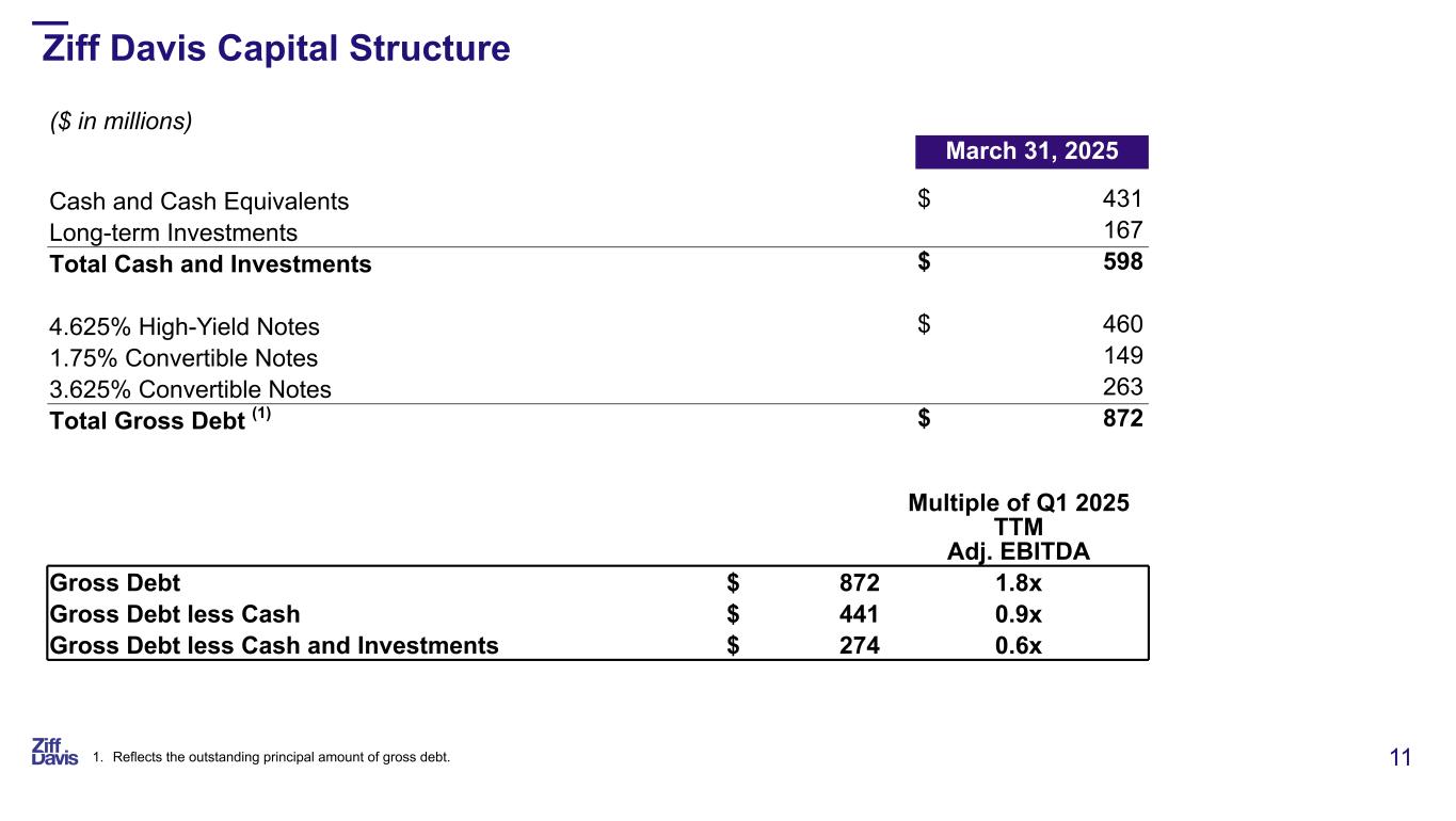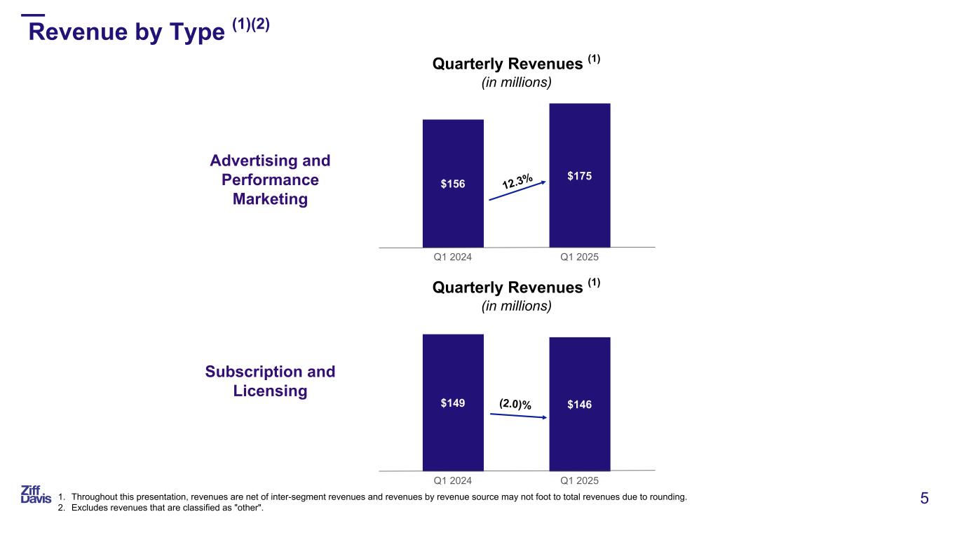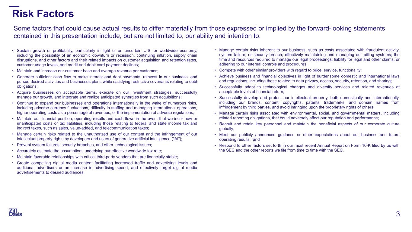 2 Certain statements in this presentation are “forward-looking statements” within the meaning of the Private Securities Litigation Reform Act of 1995, particularly those regarding our 2025 financial guidance. These forward-looking statements are based on management’s current expectations or beliefs as of May 8, 2025 (“Release Date”) and are subject to numerous assumptions, risks, and uncertainties that could cause actual results to differ materially from those described in the forward- looking statements. These factors and uncertainties include, among other items: the Company’s ability to grow advertising, licensing, and subscription revenues, profitability, and cash flows, particularly in light of an uncertain U.S. or worldwide economy, including the possibility of economic downturn or recession; the Company’s ability to make interest and debt payments; the Company’s ability to identify, close, and successfully transition acquisitions; customer growth and retention; the Company’s ability to create compelling content; our reliance on third-party platforms; the threat of content piracy and developments related to artificial intelligence; increased competition and rapid technological changes; variability of the Company’s revenue based on changing conditions in particular industries and the economy generally; protection of the Company’s proprietary technology or infringement by the Company of intellectual property of others; the risk of losing critical third-party vendors or key personnel; the risks associated with fraudulent activity, system failure, or a security breach; risks related to our ability to adhere to our internal controls and procedures; the risk of adverse changes in the U.S. or international regulatory environments, including but not limited to the imposition or increase of taxes or regulatory-related fees; the risks related to supply chain disruptions, increased tariffs and trade protection measures, inflationary conditions, and rising interest rates; the risk of liability for legal and other claims; and the numerous other factors set forth in the Company’s filings with the Securities and Exchange Commission (“SEC”). For a more detailed description of the risk factors and uncertainties affecting the Company, refer to our most recent Annual Report on Form 10-K and the other reports filed by the Company from time-to-time with the SEC, each of which is available at www.sec.gov. The forward-looking statements provided in this presentation, including those regarding our 2025 financial guidance, are based on limited information available to the Company as of the Release Date and are subject to change. Although management’s expectations may change after the Release Date, the Company undertakes no obligation to revise or update these statements. All information in this presentation speaks as of the Release Date and any redistribution or rebroadcast of this presentation after that date is not intended and will not be construed as updating or confirming such information. Capitalized terms not otherwise defined in this presentation have the meanings set forth in the Company’s earnings press release issued on the Release Date. Third-Party Information Any third-party trademarks, including names, logos and brands, referenced by the Company in this presentation are property of their respective owners. Any references to third-party trademarks are for identification purposes only and shall be considered nominative fair use under trademark law. Industry, Market and Other Data Certain information that may be contained in this presentation concerning our industry and the markets in which we operate, including our general expectations and market position, market opportunity and market size, is based on reports from various sources. Because this information involves a number of assumptions and limitations, you are cautioned not to give undue weight to such information. We have not independently verified market data and industry forecasts provided by any of these or any other third-party sources referred to in this presentation. In addition, projections, assumptions and estimates of our future performance and the future performance of the industry in which we operate are necessarily subject to a high degree of uncertainty and risk due to a variety of factors. These and other factors could cause results to differ materially from those expressed in the estimates made by third parties and by us. Non-GAAP Financial information Included in this presentation are certain financial measures that are not calculated in accordance with U.S. generally accepted accounting principles ("GAAP") and are not intended to be considered in isolation or as a substitute for, or superior to, the financial information prepared and presented in accordance with GAAP. The non-GAAP measures, as defined by Ziff Davis, may not be comparable to similar non-GAAP measures presented by other companies, limiting their usefulness for comparison purposes. The presentation of such measures, which may include adjustments to exclude unusual or non-recurring items, should not be construed as an inference that Ziff Davis’ future results or leverage will be unaffected by other unusual or non-recurring items. Please see the "Supplemental Information" to this presentation for details related to how we define these non-GAAP measures and reconciliations thereof to the most directly comparable GAAP measures. We use these non-GAAP financial measures for financial and operational decision making and as a means to evaluate period-to-period comparisons. We believe that these non-GAAP financial measures provide meaningful supplemental information regarding our performance and liquidity by excluding certain items that may not be indicative of our recurring core business operating results or, in certain cases, may be non-cash in nature. We believe that both management and investors benefit from referring to these non-