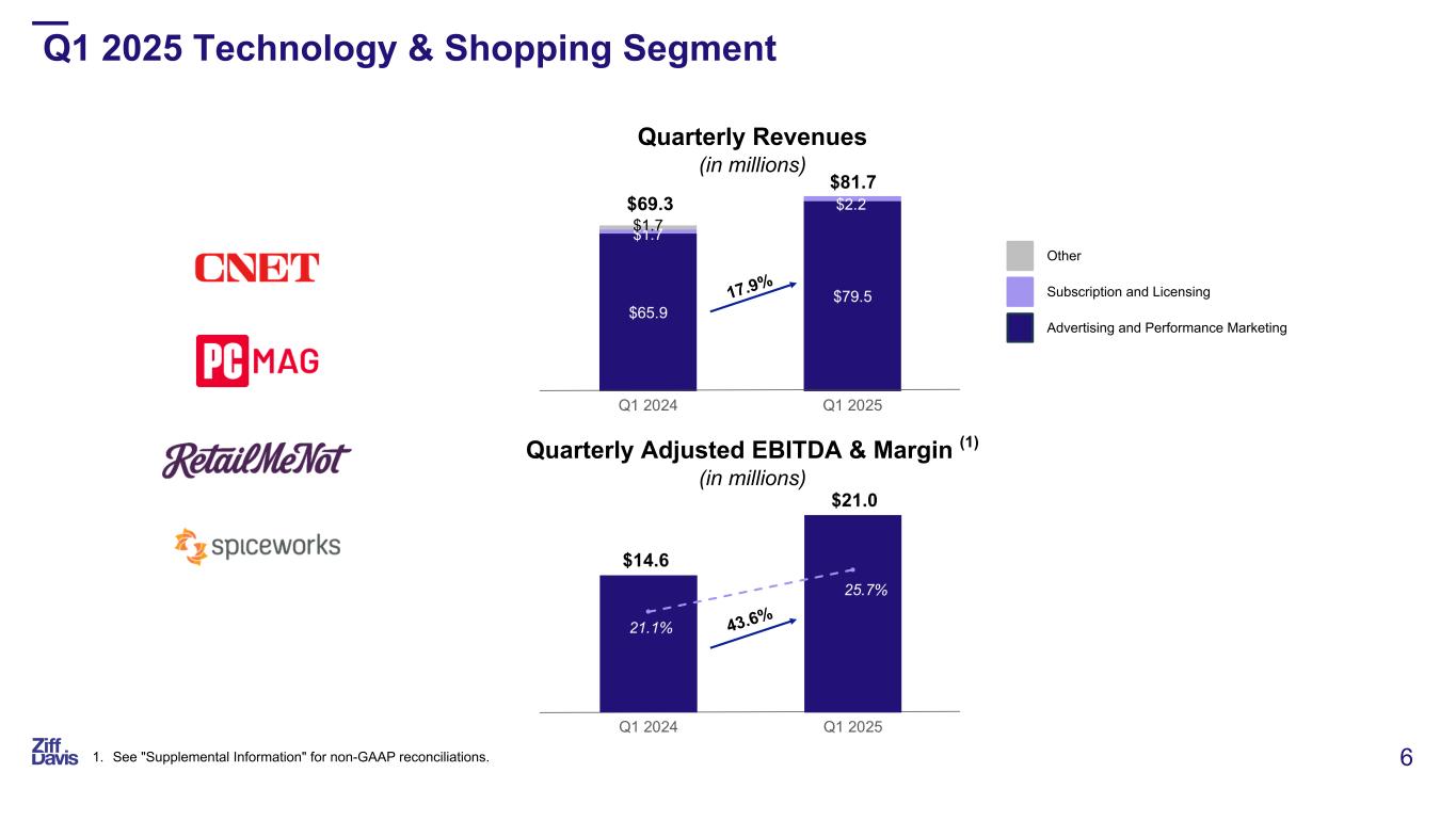 6 Q1 2025 Technology & Shopping Segment Quarterly Revenues (in millions) Quarterly Adjusted EBITDA & Margin (1) (in millions) 17.9% 43.6% Other Subscription and Licensing Advertising and Performance Marketing 1. See "Supplemental Information" for non-GAAP reconciliations.