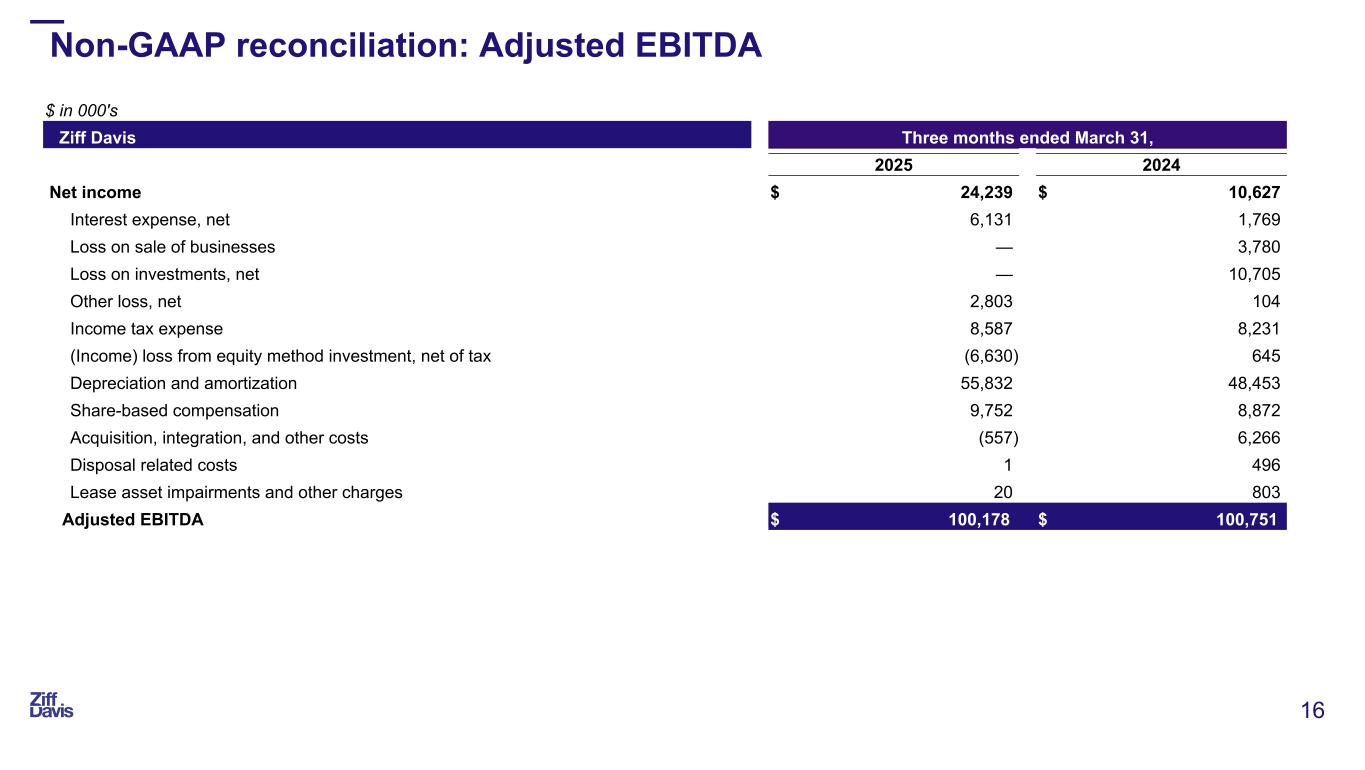 16 $ in 000's Ziff Davis Three months ended March 31, 2025 2024 Net income $ 24,239 $ 10,627 Interest expense, net 6,131 1,769 Loss on sale of businesses — 3,780 Loss on investments, net — 10,705 Other loss, net 2,803 104 Income tax expense 8,587 8,231 (Income) loss from equity method investment, net of tax (6,630) 645 Depreciation and amortization 55,832 48,453 Share-based compensation 9,752 8,872 Acquisition, integration, and other costs (557) 6,266 Disposal related costs 1 496 Lease asset impairments and other charges 20 803 Adjusted EBITDA $ 100,178 $ 100,751 Non-GAAP reconciliation: Adjusted EBITDA