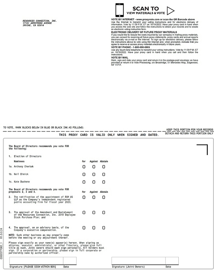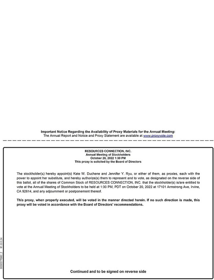 We cordially invite you to attend our 2022 Annual Meeting of Stockholders of Resources Connection, Inc., to be held at 1:30 p.m. Pacific Time, on October 20, 2022, at the Company’s headquarters in Irvine, California. The formal Notice of the Annual Meeting appears on the following page and describe the matters we expect to be acted upon at the Annual Meeting. Whether or not you plan to attend the Annual Meeting, it is important your shares be represented. Please follow the directions below to vote your shares in a timely manner.