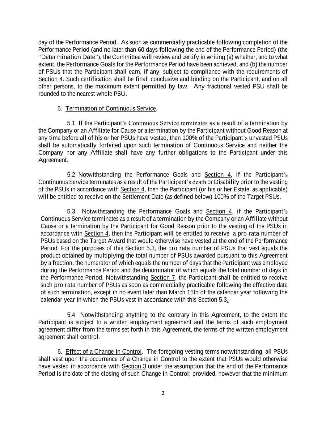 2 day of the Performance Period. As soon as commercially practicable following completion of the Performance Period (and no later than 60 days following the end of the Performance Period) (the “Determination Date”), the Committee will review and certify in writing (a) whether, and to what extent, the Performance Goals for the Performance Period have been achieved, and (b) the number of PSUs that the Participant shall earn, if any, subject to compliance with the requirements of Section 4. Such certification shall be final, conclusive and binding on the Participant, and on all other persons, to the maximum extent permitted by law. Any fractional vested PSU shall be rounded to the nearest whole PSU. 5. Termination of Continuous Service. 5.1 If the Participant’s Continuous Service terminates as a result of a termination by the Company or an Affiliate for Cause or a termination by the Participant without Good Reason at any time before all of his or her PSUs have vested, then 100% of the Participant’s unvested PSUs shall be automatically forfeited upon such termination of Continuous Service and neither the Company nor any Affiliate shall have any further obligations to the Participant under this Agreement. 5.2 Notwithstanding the Performance Goals and Section 4, if the Participant’s Continuous Service terminates as a result of the Participant’s death or Disability prior to the vesting of the PSUs in accordance with Section 4, then the Participant (or his or her Estate, as applicable) will be entitled to receive on the Settlement Date (as defined below) 100% of the Target PSUs. 5.3 Notwithstanding the Performance Goals and Section 4, if the Participant’s Continuous Service terminates as a result of a termination by the Company or an Affiliate without Cause or a termination by the Participant for Good Reason prior to the vesting of the PSUs in accordance with Section 4, then the Participant will be entitled to receive a pro rata number of PSUs based on the Target Award that would otherwise have vested at the end of the Performance Period. For the purposes of this Section 5.3, the pro rata number of PSUs that vest equals the product obtained by multiplying the total number of PSUs awarded pursuant to this Agreement by a fraction, the numerator of which equals the number of days that the Participant was employed during the Performance Period and the denominator of which equals the total number of days in the Performance Period. Notwithstanding Section 7, the Participant shall be entitled to receive such pro rata number of PSUs as soon as commercially practicable following the effective date of such termination, except in no event later than March 15th of the calendar year following the calendar year in which the PSUs vest in accordance with this Section 5.3. 5.4 Notwithstanding anything to the contrary in this Agreement, to the extent the Participant is subject to a written employment agreement and the terms of such employment agreement differ from the terms set forth in this Agreement, the terms of the written employment agreement shall control. 6. Effect of a Change in Control. The foregoing vesting terms notwithstanding, all PSUs shall vest upon the occurrence of a Change in Control to the extent that PSUs would otherwise have vested in accordance with Section 3 under the assumption that the end of the Performance Period is the date of the closing of such Change in Control; provided, however that the minimum