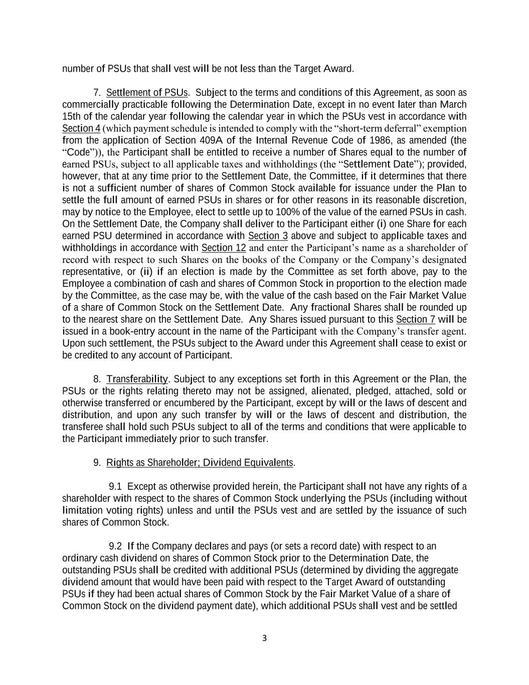 3 number of PSUs that shall vest will be not less than the Target Award. 7. Settlement of PSUs. Subject to the terms and conditions of this Agreement, as soon as commercially practicable following the Determination Date, except in no event later than March 15th of the calendar year following the calendar year in which the PSUs vest in accordance with Section 4 (which payment schedule is intended to comply with the “short-term deferral” exemption from the application of Section 409A of the Internal Revenue Code of 1986, as amended (the “Code”)), the Participant shall be entitled to receive a number of Shares equal to the number of earned PSUs, subject to all applicable taxes and withholdings (the “Settlement Date”); provided, however, that at any time prior to the Settlement Date, the Committee, if it determines that there is not a sufficient number of shares of Common Stock available for issuance under the Plan to settle the full amount of earned PSUs in shares or for other reasons in its reasonable discretion, may by notice to the Employee, elect to settle up to 100% of the value of the earned PSUs in cash. On the Settlement Date, the Company shall deliver to the Participant either (i) one Share for each earned PSU determined in accordance with Section 3 above and subject to applicable taxes and withholdings in accordance with Section 12 and enter the Participant’s name as a shareholder of record with respect to such Shares on the books of the Company or the Company’s designated representative, or (ii) if an election is made by the Committee as set forth above, pay to the Employee a combination of cash and shares of Common Stock in proportion to the election made by the Committee, as the case may be, with the value of the cash based on the Fair Market Value of a share of Common Stock on the Settlement Date. Any fractional Shares shall be rounded up to the nearest share on the Settlement Date. Any Shares issued pursuant to this Section 7 will be issued in a book-entry account in the name of the Participant with the Company’s transfer agent. Upon such settlement, the PSUs subject to the Award under this Agreement shall cease to exist or be credited to any account of Participant. 8. Transferability. Subject to any exceptions set forth in this Agreement or the Plan, the PSUs or the rights relating thereto may not be assigned, alienated, pledged, attached, sold or otherwise transferred or encumbered by the Participant, except by will or the laws of descent and distribution, and upon any such transfer by will or the laws of descent and distribution, the transferee shall hold such PSUs subject to all of the terms and conditions that were applicable to the Participant immediately prior to such transfer. 9. Rights as Shareholder; Dividend Equivalents. 9.1 Except as otherwise provided herein, the Participant shall not have any rights of a shareholder with respect to the shares of Common Stock underlying the PSUs (including without limitation voting rights) unless and until the PSUs vest and are settled by the issuance of such shares of Common Stock. 9.2 If the Company declares and pays (or sets a record date) with respect to an ordinary cash dividend on shares of Common Stock prior to the Determination Date, the outstanding PSUs shall be credited with additional PSUs (determined by dividing the aggregate dividend amount that would have been paid with respect to the Target Award of outstanding PSUs if they had been actual shares of Common Stock by the Fair Market Value of a share of Common Stock on the dividend payment date), which additional PSUs shall vest and be settled