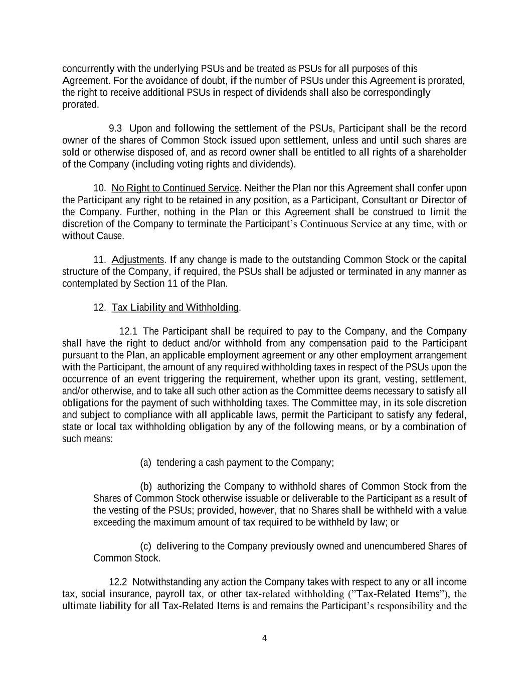 4 concurrently with the underlying PSUs and be treated as PSUs for all purposes of this Agreement. For the avoidance of doubt, if the number of PSUs under this Agreement is prorated, the right to receive additional PSUs in respect of dividends shall also be correspondingly prorated. 9.3 Upon and following the settlement of the PSUs, Participant shall be the record owner of the shares of Common Stock issued upon settlement, unless and until such shares are sold or otherwise disposed of, and as record owner shall be entitled to all rights of a shareholder of the Company (including voting rights and dividends). 10. No Right to Continued Service. Neither the Plan nor this Agreement shall confer upon the Participant any right to be retained in any position, as a Participant, Consultant or Director of the Company. Further, nothing in the Plan or this Agreement shall be construed to limit the discretion of the Company to terminate the Participant’s Continuous Service at any time, with or without Cause. 11. Adjustments. If any change is made to the outstanding Common Stock or the capital structure of the Company, if required, the PSUs shall be adjusted or terminated in any manner as contemplated by Section 11 of the Plan. 12. Tax Liability and Withholding. 12.1 The Participant shall be required to pay to the Company, and the Company shall have the right to deduct and/or withhold from any compensation paid to the Participant pursuant to the Plan, an applicable employment agreement or any other employment arrangement with the Participant, the amount of any required withholding taxes in respect of the PSUs upon the occurrence of an event triggering the requirement, whether upon its grant, vesting, settlement, and/or otherwise, and to take all such other action as the Committee deems necessary to satisfy all obligations for the payment of such withholding taxes. The Committee may, in its sole discretion and subject to compliance with all applicable laws, permit the Participant to satisfy any federal, state or local tax withholding obligation by any of the following means, or by a combination of such means: (a) tendering a cash payment to the Company; (b) authorizing the Company to withhold shares of Common Stock from the Shares of Common Stock otherwise issuable or deliverable to the Participant as a result of the vesting of the PSUs; provided, however, that no Shares shall be withheld with a value exceeding the maximum amount of tax required to be withheld by law; or (c) delivering to the Company previously owned and unencumbered Shares of Common Stock. 12.2 Notwithstanding any action the Company takes with respect to any or all income tax, social insurance, payroll tax, or other tax-related withholding (”Tax-Related Items”), the ultimate liability for all Tax-Related Items is and remains the Participant’s responsibility and the
