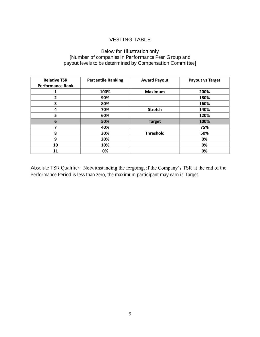 9 VESTING TABLE Below for Illustration only [Number of companies in Performance Peer Group and payout levels to be determined by Compensation Committee] Relative TSR Performance Rank Percentile Ranking Award Payout Payout vs Target 1 100% Maximum 200% 2 90% 180% 3 80% 160% 4 70% Stretch 140% 5 60% 120% 6 50% Target 100% 7 40% 75% 8 30% Threshold 50% 9 20% 0% 10 10% 0% 11 0% 0% Absolute TSR Qualifier: Notwithstanding the forgoing, if the Company’s TSR at the end of the Performance Period is less than zero, the maximum participant may earn is Target.