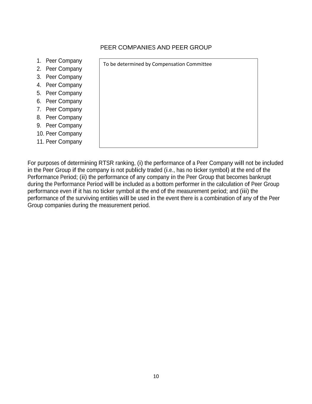 10 PEER COMPANIES AND PEER GROUP 1. Peer Company 2. Peer Company 3. Peer Company 4. Peer Company 5. Peer Company 6. Peer Company 7. Peer Company 8. Peer Company 9. Peer Company 10. Peer Company 11. Peer Company For purposes of determining RTSR ranking, (i) the performance of a Peer Company will not be included in the Peer Group if the company is not publicly traded (i.e., has no ticker symbol) at the end of the Performance Period; (ii) the performance of any company in the Peer Group that becomes bankrupt during the Performance Period will be included as a bottom performer in the calculation of Peer Group performance even if it has no ticker symbol at the end of the measurement period; and (iii) the performance of the surviving entities will be used in the event there is a combination of any of the Peer Group companies during the measurement period. To be determined by Compensation Committee