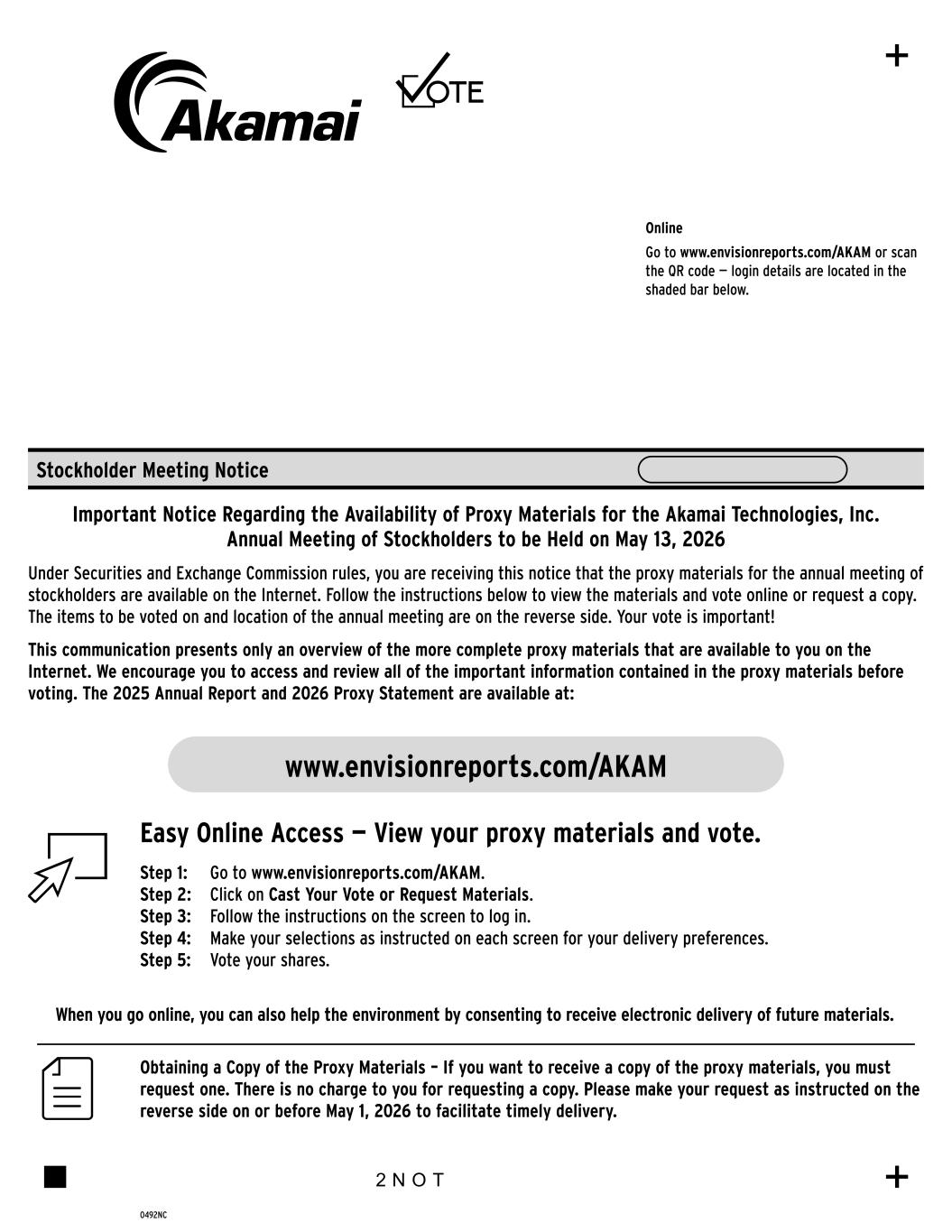 Step 1: Go to www.envisionreports.com/AKAM. Step 2: Click on Cast Your Vote or Request Materials. Step 3: Follow the instructions on the screen to log in. www.envisionreports.com/AKAM Online Go to www.envisionreports.com/AKAM or scan the QR code — login details are located in the shaded bar below. Stockholder Meeting Notice 0492NC Important Notice Regarding the Availability of Proxy Materials for the Akamai Technologies, Inc. Annual Meeting of Stockholders to be Held on May 13, 2026 Under Securities and Exchange Commission rules, you are receiving this notice that the proxy materials for the annual meeting of stockholders are available on the Internet. Follow the instructions below to view the materials and vote online or request a copy. The items to be voted on and location of the annual meeting are on the reverse side. Your vote is important! This communication presents only an overview of the more complete proxy materials that are available to you on the Internet. We encourage you to access and review all of the important information contained in the proxy materials before voting. The 2025 Annual Report and 2026 Proxy Statement are available at: Obtaining a Copy of the Proxy Materials – If you want to receive a copy of the proxy materials, you must request one. There is no charge to you for requesting a copy. Please make your request as instructed on the reverse side on or before May 1, 2026 to facilitate timely delivery. 2 N O T Easy Online Access — View your proxy materials and vote. When you go online, you can also help the environment by consenting to receive electronic delivery of future materials. Step 4: Make your selections as instructed on each screen for your delivery preferences. Step 5: Vote your shares.