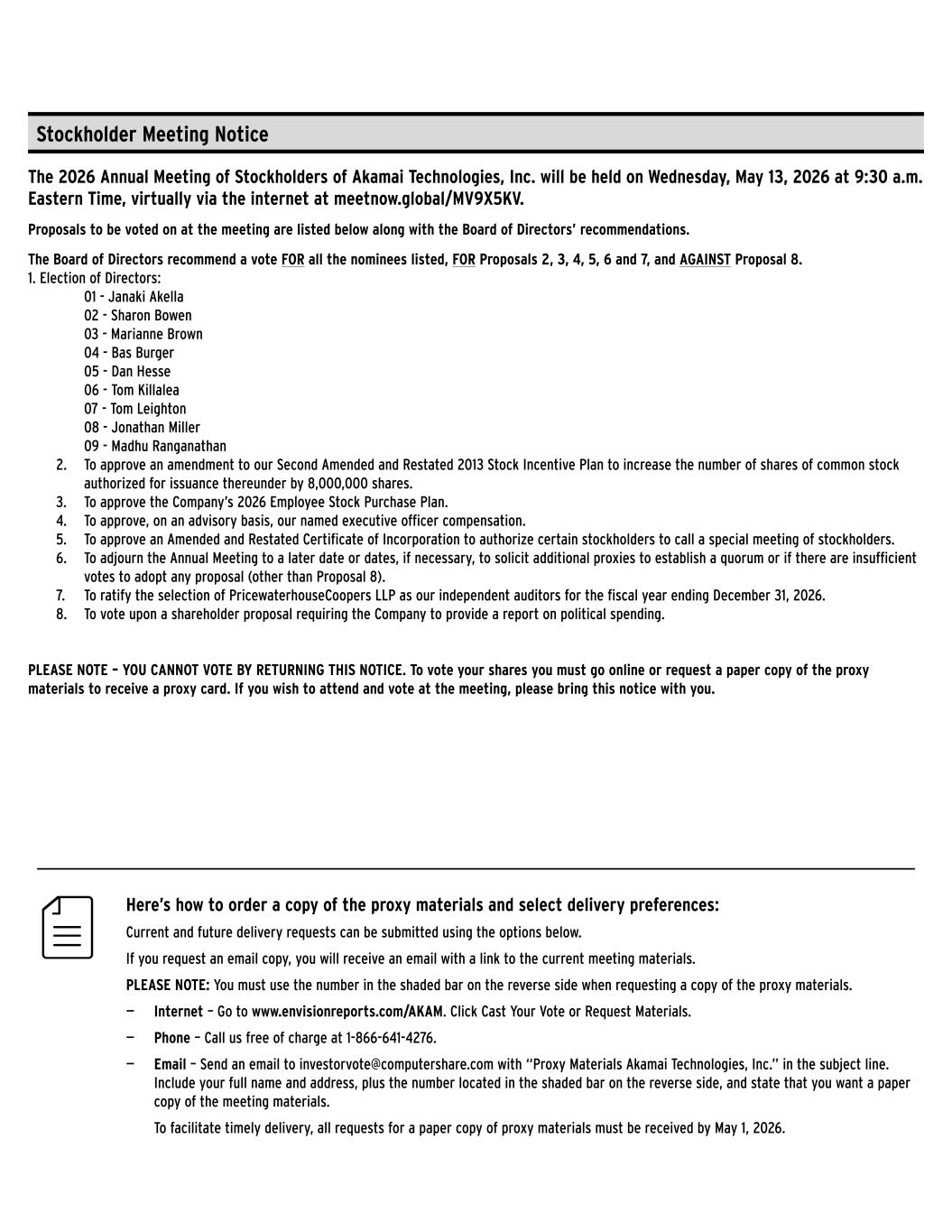 Here’s how to order a copy of the proxy materials and select delivery preferences: Current and future delivery requests can be submitted using the options below. If you request an email copy, you will receive an email with a link to the current meeting materials. PLEASE NOTE: You must use the number in the shaded bar on the reverse side when requesting a copy of the proxy materials. — Internet – Go to www.envisionreports.com/AKAM. Click Cast Your Vote or Request Materials. — Phone – Call us free of charge at 1-866-641-4276. — Email – Send an email to investorvote@computershare.com with “Proxy Materials Akamai Technologies, Inc.” in the subject line. Include your full name and address, plus the number located in the shaded bar on the reverse side, and state that you want a paper copy of the meeting materials. To facilitate timely delivery, all requests for a paper copy of proxy materials must be received by May 1, 2026. The 2026 Annual Meeting of Stockholders of Akamai Technologies, Inc. will be held on Wednesday, May 13, 2026 at 9:30 a.m. Eastern Time, virtually via the internet at meetnow.global/MV9X5KV. Proposals to be voted on at the meeting are listed below along with the Board of Directors’ recommendations. The Board of Directors recommend a vote FOR all the nominees listed, FOR Proposals 2, 3, 4, 5, 6 and 7, and AGAINST Proposal 8. 1. Election of Directors: 01 - Janaki Akella 02 - Sharon Bowen 03 - Marianne Brown 04 - Bas Burger 05 - Dan Hesse 06 - Tom Killalea 07 - Tom Leighton 08 - Jonathan Miller 09 - Madhu Ranganathan 2. To approve an amendment to our Second Amended and Restated 2013 Stock Incentive Plan to increase the number of shares of common stock authorized for issuance thereunder by 8,000,000 shares. 3. To approve the Company’s 2026 Employee Stock Purchase Plan. 4. To approve, on an advisory basis, our named executive officer compensation. 5. To approve an Amended and Restated Certificate of Incorporation to authorize certain stockholders to call a special meeting of stockholders. 6. To adjourn the Annual Meeting to a later date or dates, if necessary, to solicit additional proxies to establish a quorum or if there are insufficient votes to adopt any proposal (other than Proposal 8). 7. To ratify the selection of PricewaterhouseCoopers LLP as our independent auditors for the fiscal year ending December 31, 2026. 8. To vote upon a shareholder proposal requiring the Company to provide a report on political spending. PLEASE NOTE – YOU CANNOT VOTE BY RETURNING THIS NOTICE. To vote your shares you must go online or request a paper copy of the proxy materials to receive a proxy card. If you wish to attend and vote at the meeting, please bring this notice with you. Stockholder Meeting Notice