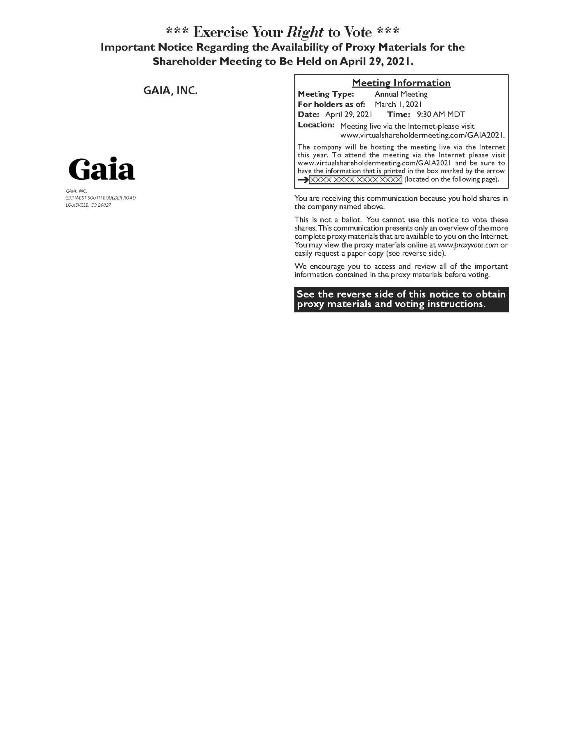 *** Exercise Your Right to Vote *** Important Notice Regarding the Availability of Proxy Materials for the Shareholder Meeting to Be Held on April 29, 2021. Meeting Information GAIA, INC. Meeting Type: Annual Meeting For holders as of: March 1, 2021 Date: April 29, 2021 Time: 9:30 AM MDT Location: Meeting live via the Internet-please visit www.virtualshareholdermeeting.com/GAIA2021. The company will be hosting the meeting live via the Internet this year. To attend the meeting via the Internet please visit www.virtualshareholdermeeting.com/GAIA2021 and be sure to have the information that is printed in the box marked by the arrow XXXX XXXX XXXX XXXX (located on the following page). GAIA, INC. 833 WEST SOUTH BOULDER ROAD LOUISVILLE, CO 80027 You are receiving this communication because you hold shares in the company named above. This is not a ballot. You cannot use this notice to vote these shares. This communication presents only an overview of the more complete proxy materials that are available to you on the Internet. You may view the proxy materials online at www.proxyvote.com or easily request a paper copy (see reverse side). We encourage you to access and review all of the important information contained in the proxy materials before voting. See the reverse side of this notice to obtain proxy materials and voting instructions.