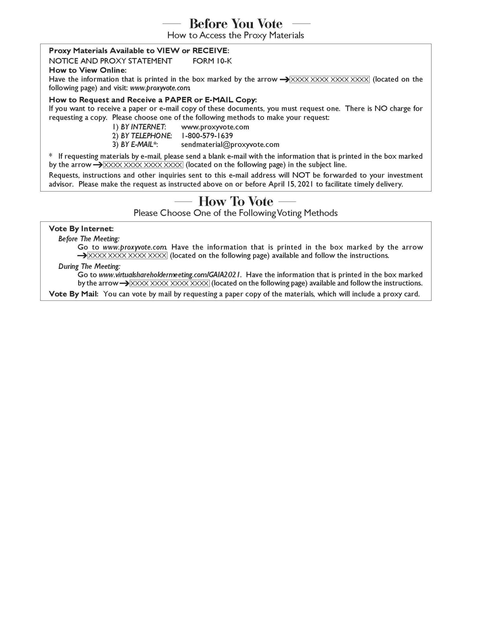 Before You Vote How to Access the Proxy Materials Proxy Materials Available to VIEW or RECEIVE: NOTICE AND PROXY STATEMENT FORM 10-K How to View Online: Have the information that is printed in the box marked by the arrow XXXX XXXX XXXX XXXX (located on the following page) and visit: www.proxyvote.com. How to Request and Receive a PAPER or E-MAIL Copy: If you want to receive a paper or e-mail copy of these documents, you must request one. There is NO charge for requesting a copy. Please choose one of the following methods to make your request: 1) BY INTERNET: www.proxyvote.com 2) BY TELEPHONE: 1-800-579-1639 3) BY E-MAIL*: sendmaterial@proxyvote.com * If requesting materials by e-mail, please send a blank e-mail with the information that is printed in the box markedby the arrow XXXX XXXX XXXX XXXX (located on the following page) in the subject line. Requests, instructions and other inquiries sent to this e-mail address will NOT be forwarded to your investment advisor. Please make the request as instructed above on or before April 15, 2021 to facilitate timely delivery. How To Vote Please Choose One of the Following Voting Methods Vote By Internet: Before The Meeting: Go to www.proxyvote.com. Have the information that is printed in the box marked by the arrow XXXX XXXX XXXX XXXX (located on the following page) available and follow the instructions. During The Meeting: Go to www.virtualshareholdermeeting.com/GAIA2021. Have the information that is printed in the box marked by the arrow XXXX XXXX XXXX XXXX (located on the following page) available and follow the instructions. Vote By Mail: You can vote by mail by requesting a paper copy of the materials, which will include a proxy card.