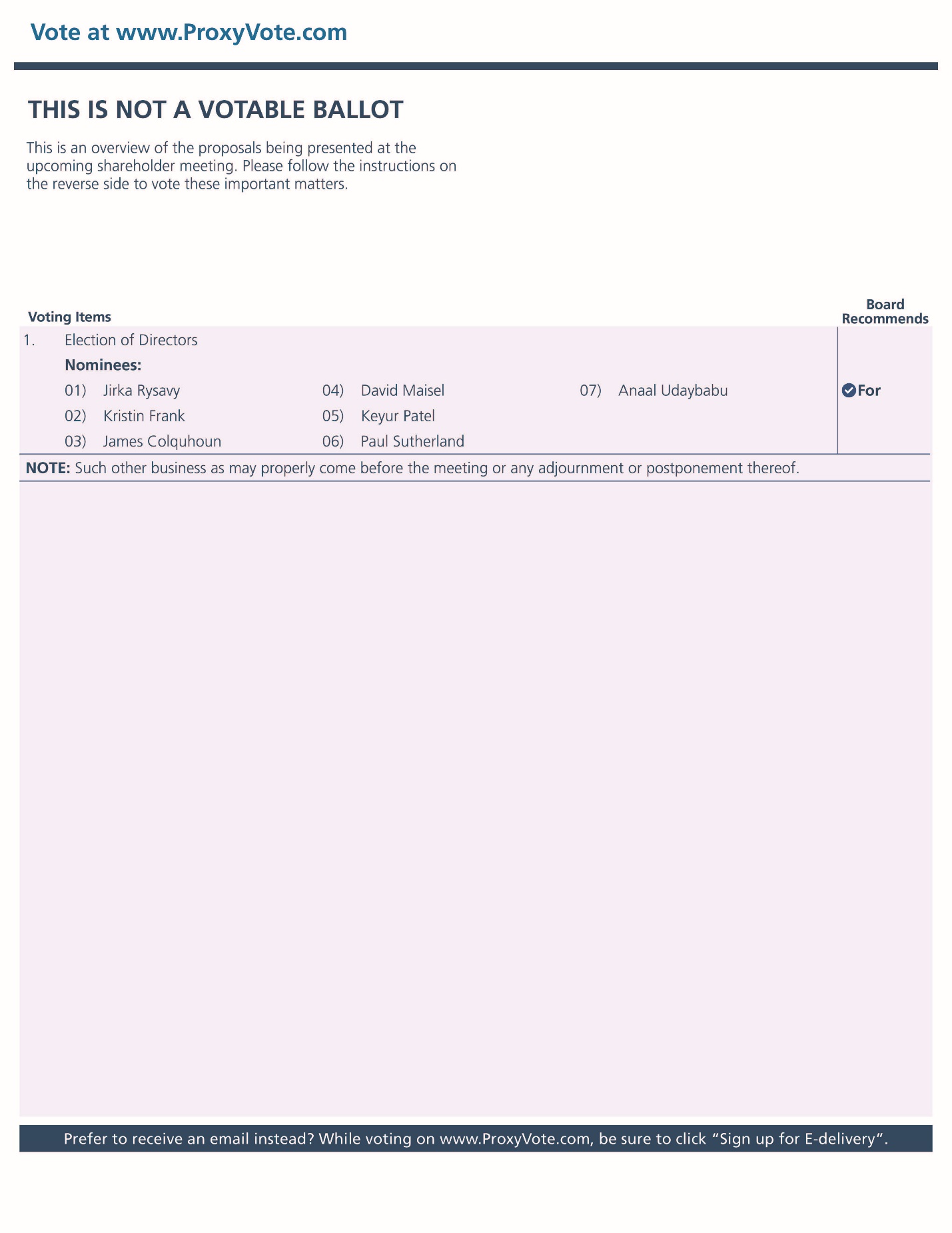 Vote at www.ProxyVote.com THIS IS NOT A VOTABLE BALLOT This is an overview of the proposals being presented at the upcoming shareholder meeting. Please follow the instructions on the reverse side to vote these important matters. Voting Items 1. Election of Directors Nominees: 01) Jirka Rysavy 02) Kristin Frank 03) James Colquhoun 04) David Maisel 05) Keyur Patel 06) Paul Sutherland 07) Anaal Udaybabu Board Recommends NOTE: Such other business as may properly come before the meeting or any adjournment or postponement thereof. Prefer to receive an email instead? While voting on www.ProxyVote.com, be sure to click "Sign up for E-delivery".