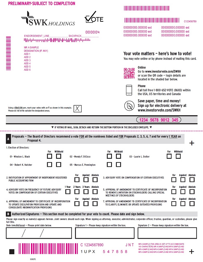 4. ADVISORY VOTE ON FREQUENCY OF FUTURE ADVISORY VOTES ON COMPENSATION OF CERTAIN EXECUTIVES 2 1 Year Years 3 Years Abstain 01 - Winston L. Black 04 - Robert K. Hatcher 02 - Wendy F. DiCicco 05 - Marcus E. Pennington 03 - Laurie L. Dotter For Withhold For Withhold For Withhold 1 U P X Using a black ink pen, mark your votes with an X as shown in this example. Please do not write outside the designated areas. 03O2TC + + Proposals — The Board of Directors recommend a vote FOR all the nominees listed and FOR Proposals 2, 3, 5, 6, 7 and for every 1 YEAR on A Proposal 4. 2. RATIFICATION OF APPOINTMENT OF INDEPENDENT REGISTERED PUBLIC ACCOUNTING FIRM 3. ADVISORY VOTE ON COMPENSATION OF CERTAIN EXECUTIVES 1. Election of Directors: For Against Abstain Please sign exactly as name(s) appears hereon. Joint owners should each sign. When signing as attorney, executor, administrator, corporate officer, trustee, guardian, or custodian, please give full title. Date (mm/dd/yyyy) — Please print date below. Signature 1 — Please keep signature within the box. Signature 2 — Please keep signature within the box. B Authorized Signatures — This section must be completed for your vote to count. Please date and sign below. q IF VOTING BY MAIL, SIGN, DETACH AND RETURN THE BOTTOM PORTION IN THE ENCLOSED ENVELOPE.q For Against Abstain 5. APPROVAL OF AMENDMENT TO CERTIFICATE OF INCORPORATION TO REMOVE LIMITATION ON STOCKHOLDERS CALLING SPECIAL MEETINGS OF STOCKHOLDERS 6. APPROVAL OF AMENDMENT TO CERTIFICATE OF INCORPORATION TO UPDATE EXCULPATION PROVISION AND UPDATE AND CONSOLIDATE INDEMNIFICATION PROVISIONS 7. APPROVAL OF AMENDMENT TO CERTIFICATE OF INCORPORATION TO CLARIFY, ELIMINATE OR UPDATE OUTDATED PROVISIONS For Against Abstain For Against Abstain For Against Abstain 000004 MR A SAMPLE DESIGNATION (IF ANY) ADD 1 ADD 2 ADD 3 ADD 4 ADD 5 ADD 6 ENDORSEMENT_LINE______________ SACKPACK_____________ 1234 5678 9012 345 MMMMMMMMM MMMMMMMMMMMMMMM 5 4 7 8 5 8 MR A SAMPLE (THIS AREA IS SET UP TO ACCOMMODATE 140 CHARACTERS) MR A SAMPLE AND MR A SAMPLE AND MR A SAMPLE AND MR A SAMPLE AND MR A SAMPLE AND MR A SAMPLE AND MR A SAMPLE AND MR A SAMPLE AND C 1234567890 J N T C123456789 MMMMMMMMMMMM M MMMMMMM 000000000.000000 ext 000000000.000000 ext 000000000.000000 ext 000000000.000000 ext 000000000.000000 ext 000000000.000000 ext If no electronic voting, delete QR code and control # Δ ≈ PRELIMINARY-SUBJECT TO COMPLETION You may vote online or by phone instead of mailing this card. Online Go to www.investorvote.com/SWKH or scan the QR code — login details are located in the shaded bar below. Save paper, time and money! Sign up for electronic delivery at www.investorvote.com/SWKH Phone Call toll free 1-800-652-VOTE (8683) within the USA, US territories and Canada Your vote matters – here’s how to vote!