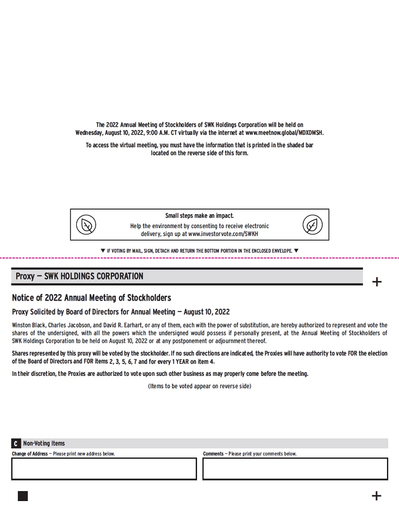 Small steps make an impact. Help the environment by consenting to receive electronic delivery, sign up at www.investorvote.com/SWKH Notice of 2022 Annual Meeting of Stockholders Proxy Solicited by Board of Directors for Annual Meeting — August 10, 2022 Winston Black, Charles Jacobson, and David R. Earhart, or any of them, each with the power of substitution, are hereby authorized to represent and vote the shares of the undersigned, with all the powers which the undersigned would possess if personally present, at the Annual Meeting of Stockholders of SWK Holdings Corporation to be held on August 10, 2022 or at any postponement or adjournment thereof. Shares represented by this proxy will be voted by the stockholder. If no such directions are indicated, the Proxies will have authority to vote FOR the election of the Board of Directors and FOR items 2, 3, 5, 6, 7 and for every 1 YEAR on item 4. In their discretion, the Proxies are authorized to vote upon such other business as may properly come before the meeting. (Items to be voted appear on reverse side) Proxy — SWK HOLDINGS CORPORATION q IF VOTING BY MAIL, SIGN, DETACH AND RETURN THE BOTTOM PORTION IN THE ENCLOSED ENVELOPE.q Change of Address — Please print new address below. Comments — Please print your comments below. C Non-Voting Items + + The 2022 Annual Meeting of Stockholders of SWK Holdings Corporation will be held on Wednesday, August 10, 2022, 9:00 A.M. CT virtually via the internet at www.meetnow.global/MDXDMSH. To access the virtual meeting, you must have the information that is printed in the shaded bar located on the reverse side of this form.