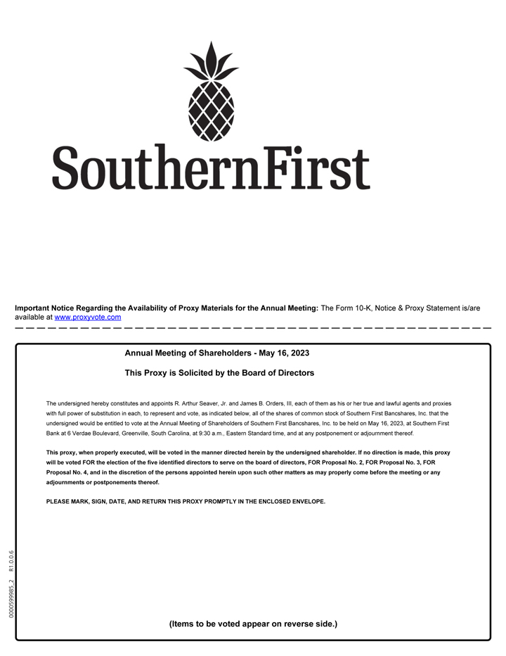 We cordially invite you to attend the 2023 Annual Meeting of Shareholders of Southern First Bancshares, Inc. (the “Company” or “Southern First”), the holding company for Southern First Bank (the “Bank”). At the meeting, we will report on our performance in 2022 and answer your questions. We look forward to discussing both our accomplishments and our future plans with you. We hope that you can attend the meeting and look forward to seeing you there.