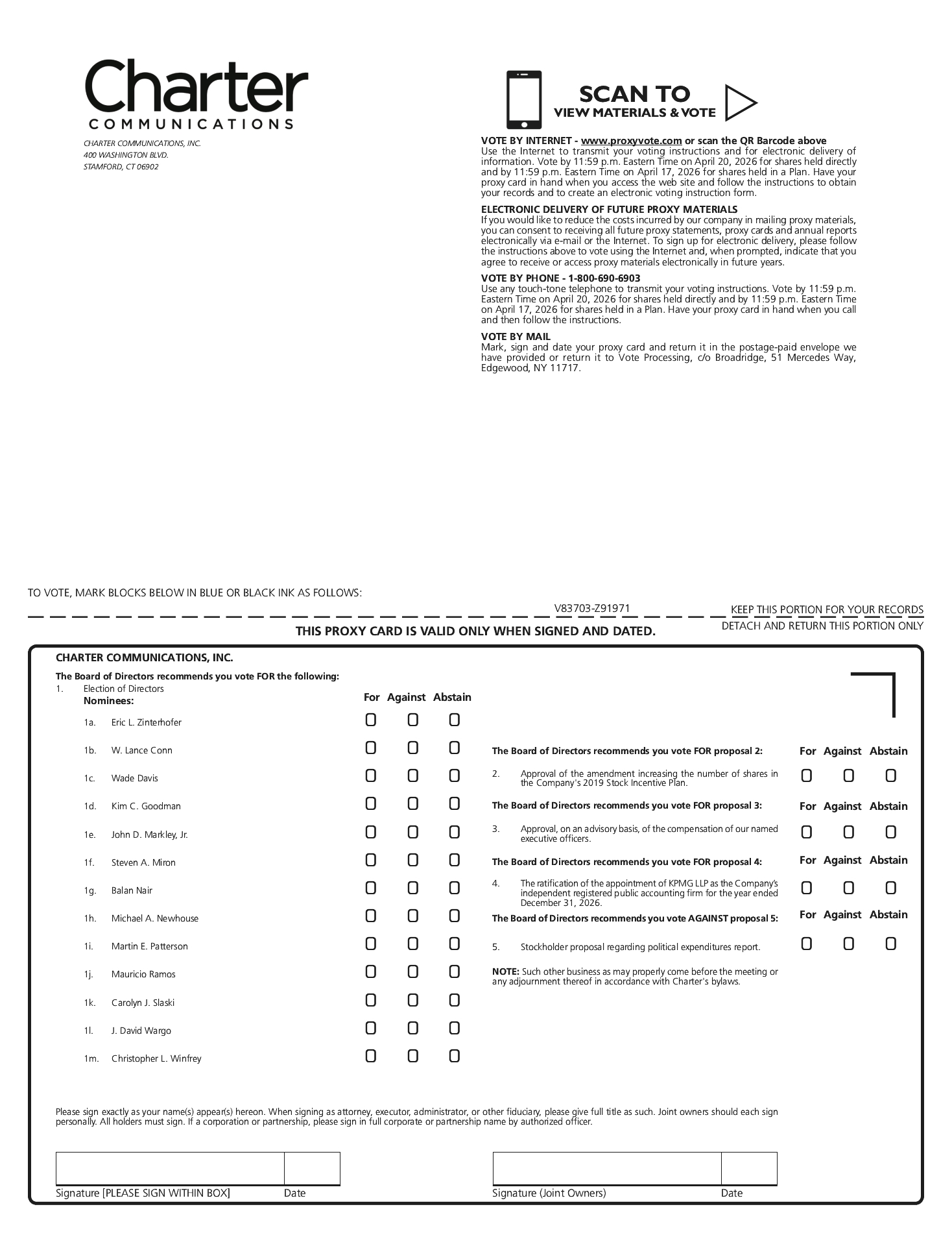 2025, approximately 28% of the total voting power of the issued and outstanding shares of Charter common stock in favor of the Certificate Amendment (as defined in the Transaction Agreement by and among the Company, Charter Holdings and Cox Enterprises, dated May 16, 2025 (the “Transaction Agreement”)) and the issuance of shares and units to Cox Enterprises as the Equity Consideration (as defined in the Transaction Agreement) and against any action or proposal in favor of any Columbus Acquisition Proposal (as defined in the Transaction Agreement) at any meeting of the stockholders of Charter called to vote upon such matters.
