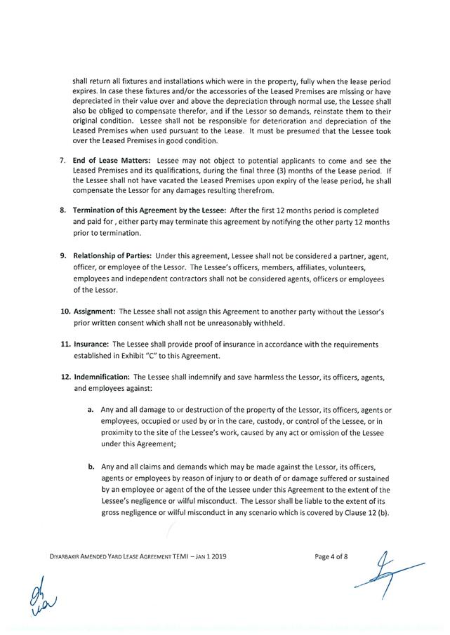 DIYARBAKIR AMENDED YARD LEASE AGREEMENT-TEMI Lessor: lami Erdem Uras - Resident in Blrlik Mahallesi Zirvekent 2. Etap, C4/3 06610 Ankara, Turkey Lessee: TransAtlantic Exploration Med. Int. Pt y. Ltd. Merkezi Avustralya Tiirkiye Ankara Ubesi lran Cad . No 21 Karum I Merkezi F Blok Kat:5/427 Kavaklidere Ankaya Ankara Effective Date: January 1, 2019 For adequate consideration, the receipt and sufficiency of which is acknowledged, Lessor, named above, leases and lets to Lessee, named above, a portion (such portion being referred to herein as the "Leased Premises" ) of the following six parcels of land located at Diyarbakir Urfa Road at 12 kilometer , Diyarbakir in the Republic of Turkey. The portion of the Yard that constitutes the "Leased Premises" is more specifically described on the Certificates attached hereto under Exhibit "A", the entirety of the six parcels being referred to as the "Yard". The portion of the Yard that constitutes the "Leased Premises" is more specifically described on attached Exhibit "B" This Lease amends and supersedes all existing leases of the Yard or Leased Premises between Lessor and Lessee .For adequate consideration, this Agreement is entered into and a lease of the Yard (the "lease") is granted by lessor and accepted by Lessee on the following terms: Basic Terms 1. Use of the Leased Premise: : Lessor shall be permitted to use the leased Premises for storage, maintenance and staging of materials and equipment for oilfield services and services related to oil & gas drilling , exploration, development, geological or geophysical activities or oilfield infrastructure for the term of this Agreement.2. Purpose lessee agrees that the lease of the leased Premises shall be for the sole purpose of the lessee's uses related to oilfield services and services related to oil & gas drilling, exploration, development, geological or geophysical activities and infrastructure. Any costs associated with the use and maintenance of the property by the Lessee for lessee's purposes shall be at the sole expense of the Lessee.3. Lease Period: The term of this Agreement shall commence upon the effective date and shall extend for a period of 60 months.4. Rent: The lessor agrees to provide the lessee with the use of the Leased Premises for a monthly gross rental amount in US Dollars payable within first five (5) business days of each month for the term of this Agreement into the Turkish bank account designated by the lessor, during each yearly period as follows: