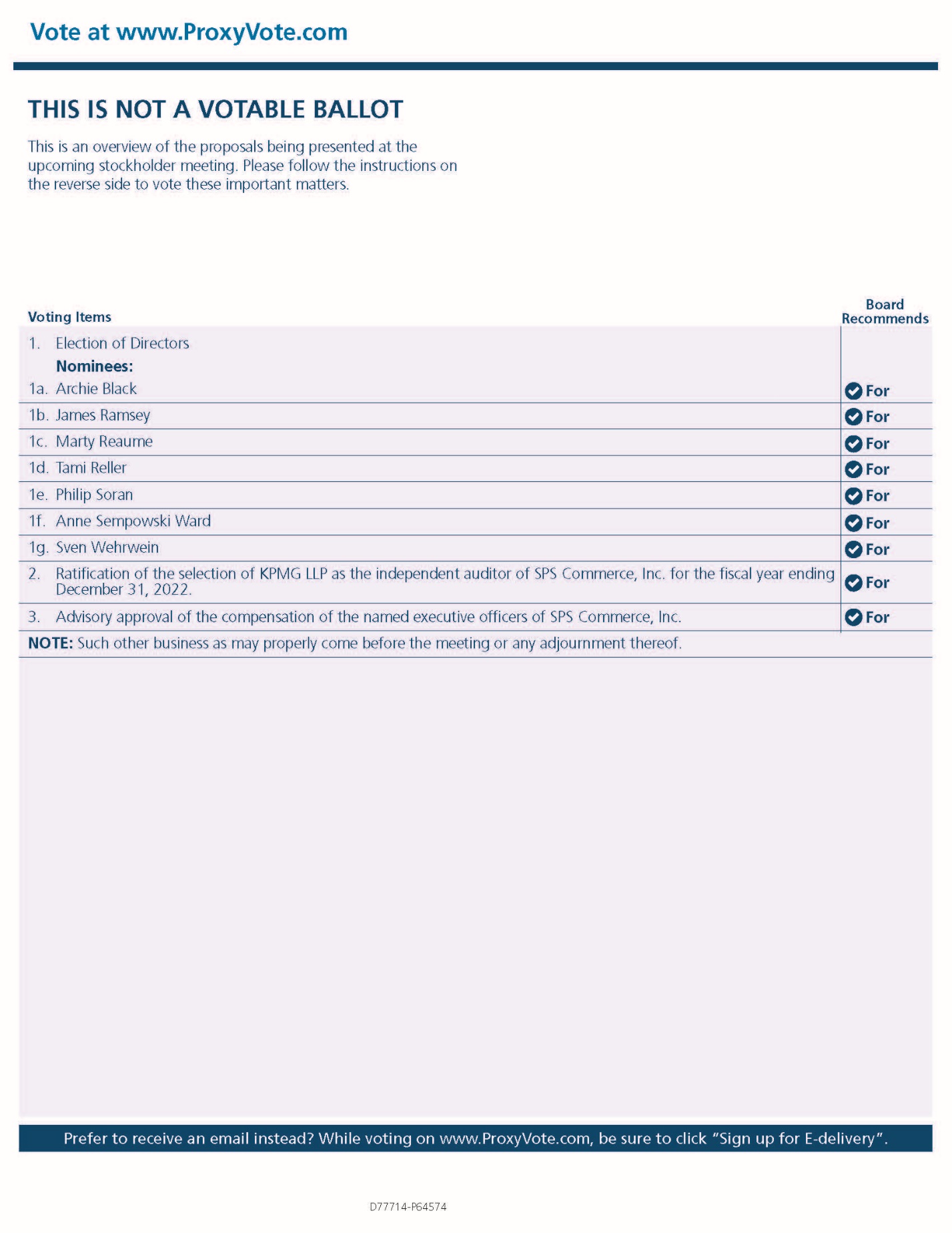 Vote at www.ProxyVote.com THIS IS NOT A VOTABLE BALLOT This is an overview of the proposals being presented at the upcoming stockholder meeting. Please follow the instructions on the reverse side to vote these important matters. Board Recommends Voting Items 1. Election of Directors Nominees: 1a. Archie Black For 1b. James Ramsey For 1c. Marty Reaume For 1d. Tami Reller For 1e. Philip Soran For 1f. Anne Sempowski Ward For 1g. Sven Wehrwein For 2. Ratification of the selection of KPMG LLP as the independent auditor of SPS Commerce, Inc. for the fiscal year ending December 31, 2022. For For 3. Advisory approval of the compensation of the named executive officers of SPS Commerce, Inc. NOTE: Such other business as may properly come before the meeting or any adjournment thereof. Prefer to receive an email instead? While voting on www.ProxyVote.com, be sure to click “Sign up for E-delivery”. D77714-P64574