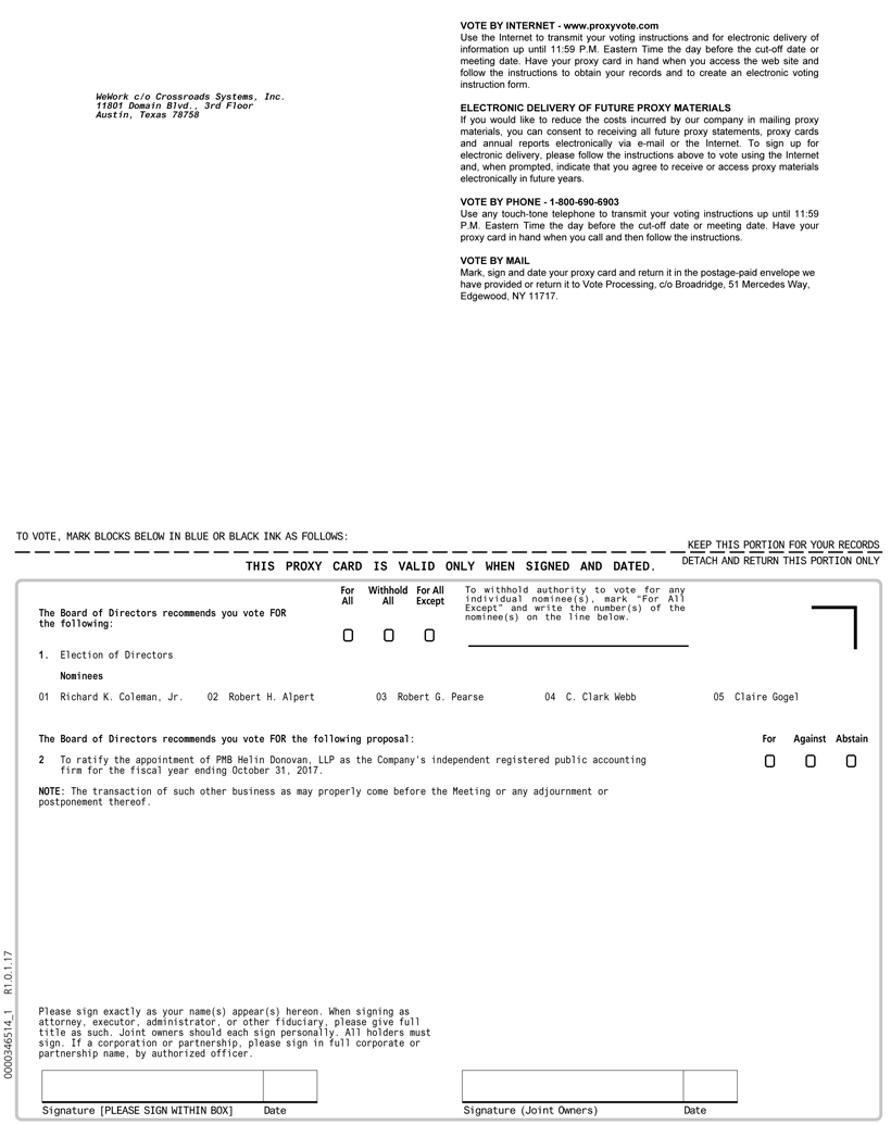Use the Internet to transmit your voting instructions and for electronic delivery of information up until 11:59 P.M. Eastern Time the day before the cut-off date or meeting date. Have your proxy card in hand when you access the web site and follow the instructions to obtain your records and to create an electronic voting instruction form. WeWork c/o Crossroads Systems, Inc. 11801 Domain Blvd., 3rd Floor ELECTRONIC DELIVERY OF FUTURE PROXY MATERIALS Austin, Texas 78758 If you would like to reduce the costs incurred by our company in mailing proxy materials, you can consent to receiving all future proxy statements, proxy cards and annual reports electronically via e-mail or the Internet. To sign up for electronic delivery, please follow the instructions above to vote using the Internet and, when prompted, indicate that you agree to receive or access proxy materials electronically in future years. VOTE BY PHONE - 1-800-690-6903 Use any touch-tone telephone to transmit your voting instructions up until 11:59 P.M. Eastern Time the day before the cut-off date or meeting date. Have your proxy card in hand when you call and then follow the instructions. VOTE BY MAIL Mark, sign and date your proxy card and return it in the postage-paid envelope we have provided or return it to Vote Processing, c/o Broadridge, 51 Mercedes Way, Edgewood, NY 11717. TO VOTE, MARK BLOCKS BELOW IN BLUE OR BLACK INK AS FOLLOWS: KEEP THIS PORTION FOR YOUR RECORDS DETACH AND RETURN THIS PORTION ONLY THIS PROXY CARD IS VALID ONLY WHEN SIGNED AND DATED. For Withhold For All To withhold authority to vote for any individual nominee(s), mark “For All Except” and write the number(s) of the nominee(s) on the line below. All All Except ¨ ¨ ¨ The Board of Directors recommends you vote FOR the following: 1. Election of Directors Nominees 01 Richard K. Coleman, Jr. 02 Robert H. Alpert 03 Robert G. Pearse 04 C. Clark Webb 05 Claire Gogel The Board of Directors recommends you vote FOR the following proposal: For Against Abstain 2 To ratify the appointment of PMB Helin Donovan, LLP as the Company's independent registered public accounting ¨ ¨ ¨ firm for the fiscal year ending October 31, 2017. NOTE: The transaction of such other business as may properly come before the Meeting or any adjournment or postponement thereof. Please sign exactly as your name(s) appear(s) hereon. When signing as attorney, executor, administrator, or other fiduciary, please give full title as such. Joint owners should each sign personally. All holders must sign. If a corporation or partnership, please sign in full corporate or partnership name, by authorized officer. Signature [PLEASE SIGN WITHIN BOX] Date Signature (Joint Owners) Date