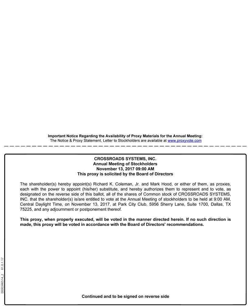 Important Notice Regarding the Availability of Proxy Materials for the Annual Meeting: The Notice & Proxy Statement, Letter to Stockholders are available at www.proxyvote.com CROSSROADS SYSTEMS, INC. Annual Meeting of Stockholders November 13, 2017 09:00 AM This proxy is solicited by the Board of Directors The shareholder(s) hereby appoint(s) Richard K. Coleman, Jr. and Mark Hood, or either of them, as proxies, each with the power to appoint (his/her) substitute, and hereby authorizes them to represent and to vote, as designated on the reverse side of this ballot, all of the shares of Common stock of CROSSROADS SYSTEMS, INC. that the shareholder(s) is/are entitled to vote at the Annual Meeting of stockholders to be held at 9:00 AM, Central Daylight Time, on November 13, 2017, at Park City Club, 5956 Sherry Lane, Suite 1700, Dallas, TX 75225, and any adjournment or postponement thereof. This proxy, when properly executed, will be voted in the manner directed herein. If no such direction is made, this proxy will be voted in accordance with the Board of Directors' recommendations. Continued and to be signed on reverse side 0000346514_2 R1.0.1.17