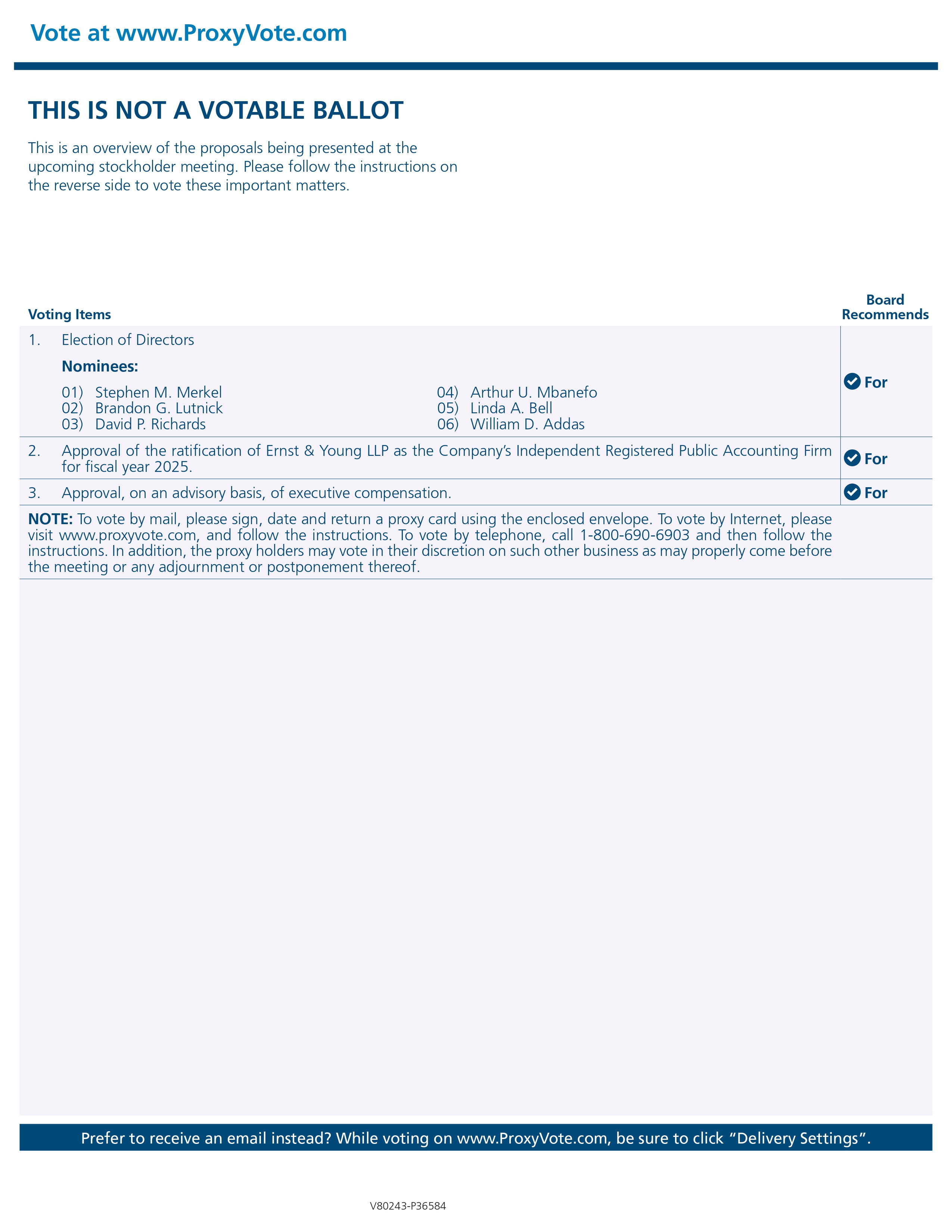 Vote at www.ProxyVote.com THIS IS NOT A VOTABLE BALLOT This is an overview of the proposals being presented at the upcoming stockholder meeting. Please follow the instructions on the reverse side to vote these important matters. Prefer to receive an email instead? While voting on www.ProxyVote.com, be sure to click “Delivery Settings”. For 1. Election of Directors Nominees: 1) Stephen M. Merkel 04) Arthur U. Mbanefo 2) Brandon G. Lutnick 05) Linda A. Bell 3) David P. Richards 06) William D. Addas For 2. Approval of the ratification of Ernst & Young LLP as the Company’s Independent Registered Public Accounting Firm for fiscal year 2025. For 3. Approval, on an advisory basis, of executive compensation. NOTE : To vote by mail, please sign, date and return a proxy card using the enclosed envelope . To vote by Internet, please visit www . proxyvote . com, and follow the instructions . To vote by telephone, call 1 - 800 - 690 - 6903 and then follow the instructions . In addition, the proxy holders may vote in their discretion on such other business as may properly come before the meeting or any adjournment or postponement thereof . Voting Items Board Recommends V77259 - P36584