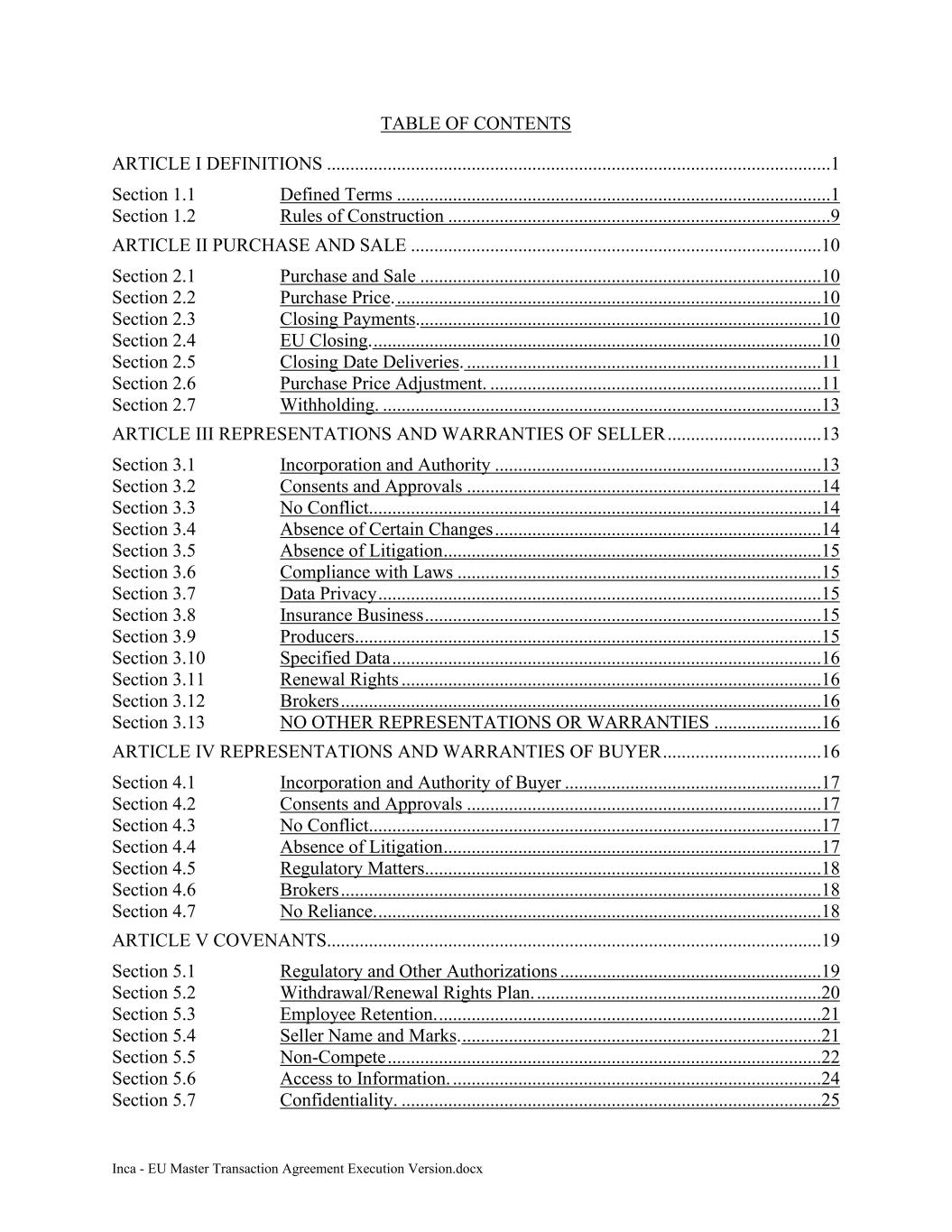 Inca - EU Master Transaction Agreement Execution Version.docx TABLE OF CONTENTS ARTICLE I DEFINITIONS ............................................................................................................1 Section 1.1 Defined Terms .............................................................................................1 Section 1.2 Rules of Construction ..................................................................................9 ARTICLE II PURCHASE AND SALE ........................................................................................10 Section 2.1 Purchase and Sale ......................................................................................10 Section 2.2 Purchase Price. ...........................................................................................10 Section 2.3 Closing Payments.......................................................................................10 Section 2.4 EU Closing. ................................................................................................10 Section 2.5 Closing Date Deliveries. ............................................................................11 Section 2.6 Purchase Price Adjustment. .......................................................................11 Section 2.7 Withholding. ..............................................................................................13 ARTICLE III REPRESENTATIONS AND WARRANTIES OF SELLER .................................13 Section 3.1 Incorporation and Authority ......................................................................13 Section 3.2 Consents and Approvals ............................................................................14 Section 3.3 No Conflict.................................................................................................14 Section 3.4 Absence of Certain Changes ......................................................................14 Section 3.5 Absence of Litigation .................................................................................15 Section 3.6 Compliance with Laws ..............................................................................15 Section 3.7 Data Privacy ...............................................................................................15 Section 3.8 Insurance Business .....................................................................................15 Section 3.9 Producers....................................................................................................15 Section 3.10 Specified Data ............................................................................................16 Section 3.11 Renewal Rights ..........................................................................................16 Section 3.12 Brokers .......................................................................................................16 Section 3.13 NO OTHER REPRESENTATIONS OR WARRANTIES .......................16 ARTICLE IV REPRESENTATIONS AND WARRANTIES OF BUYER ..................................16 Section 4.1 Incorporation and Authority of Buyer .......................................................17 Section 4.2 Consents and Approvals ............................................................................17 Section 4.3 No Conflict.................................................................................................17 Section 4.4 Absence of Litigation .................................................................................17 Section 4.5 Regulatory Matters.....................................................................................18 Section 4.6 Brokers .......................................................................................................18 Section 4.7 No Reliance. ...............................................................................................18 ARTICLE V COVENANTS..........................................................................................................19 Section 5.1 Regulatory and Other Authorizations ........................................................19 Section 5.2 Withdrawal/Renewal Rights Plan. .............................................................20 Section 5.3 Employee Retention. ..................................................................................21 Section 5.4 Seller Name and Marks. .............................................................................21 Section 5.5 Non-Compete .............................................................................................22 Section 5.6 Access to Information. ...............................................................................24 Section 5.7 Confidentiality. ..........................................................................................25